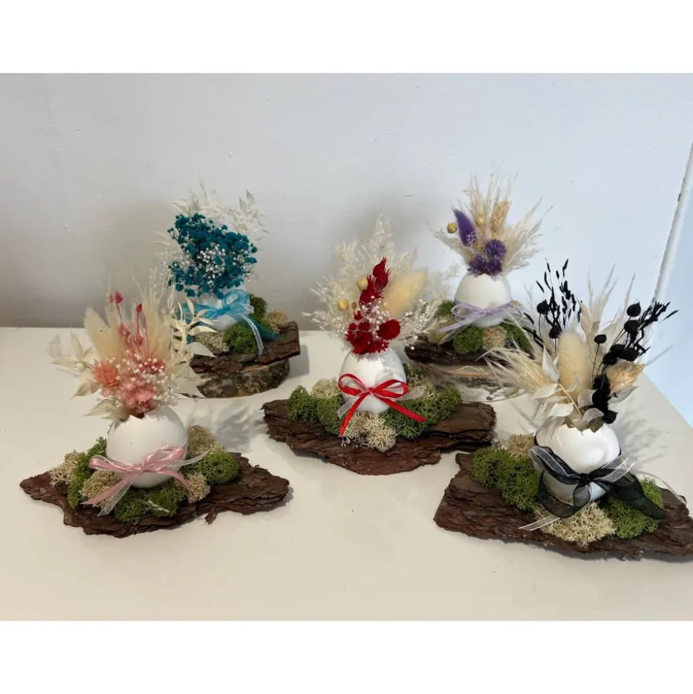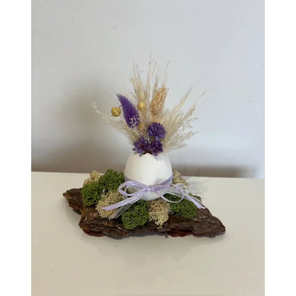 Hier biete ich verschiedene schöne Ostergestecke mit echtem Ei und Trockenblumen auf einer Baumrinde an, die ich mit sehr viel Liebe zum Detail selbst hergestellt habe 🙂
