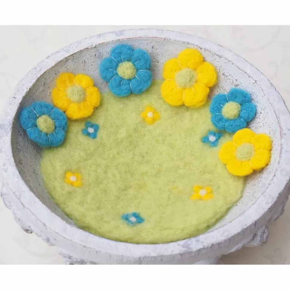 Dekoriere zur Frühlings- oder Osterzeit dein zu Hause mit dieser zauberhaften Blumenwiese aus Nadelfilz. Die Wiese eignet sich toll als Tischdeko oder dekoriere sie mit anderen Osterartikeln. Auch toll als Osternestdeko! Sie wird in Handarbeit aus 100 % Wolle angefertigt. Die runde Wiese ist in einem zarten hellgrünen Ton, die Blumen sind in mittelblauem und gelborangenem Ton gearbeitet. Sie hat eine handliche Größe von ca 17,5 cm Durchmesser.