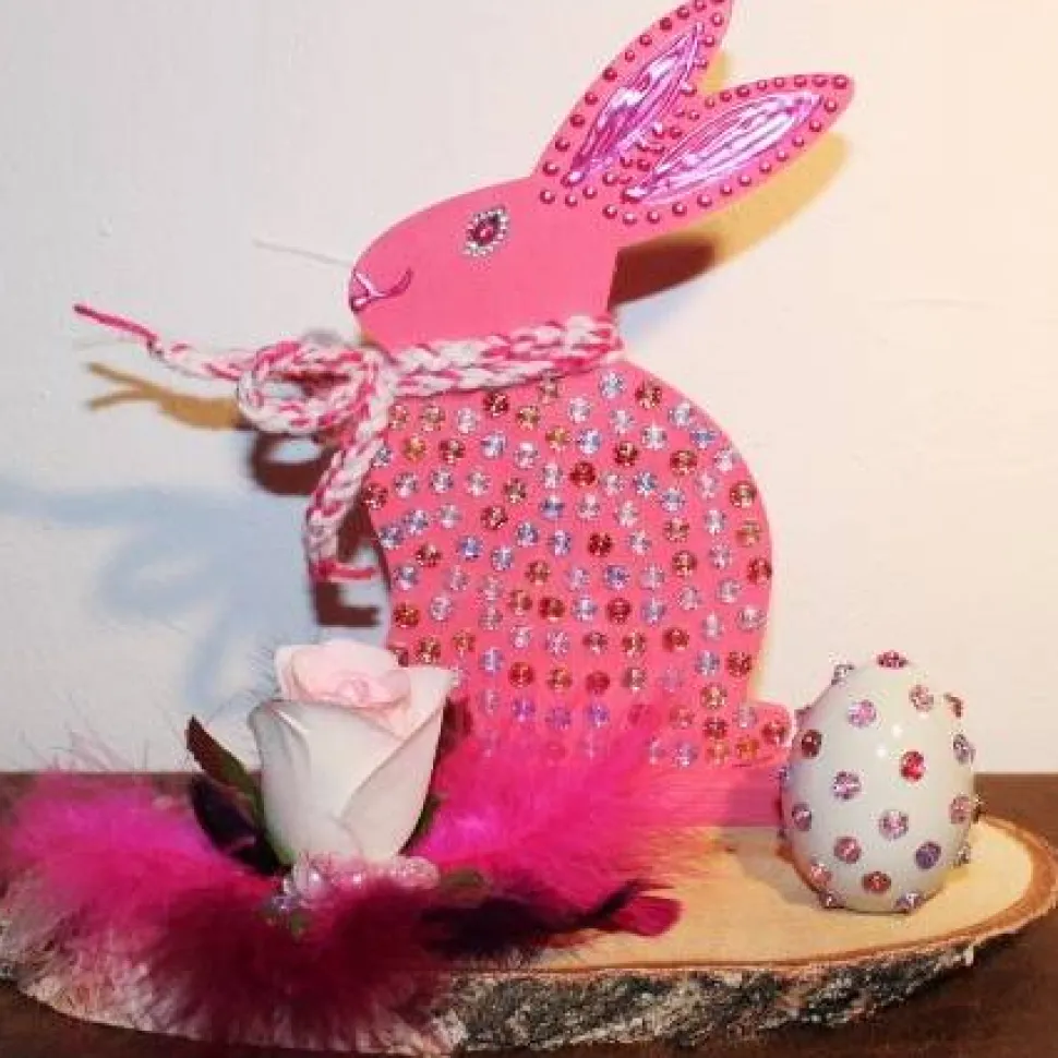 Ein Holzhase auf einer Baumscheibe mit Acrylfarben bemalt und mit unzähligen Glitzersteinen in Rosenform beklebt, mit einem gehäkelten Schleifchen verziert.