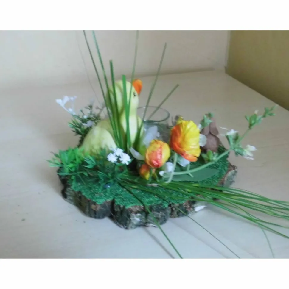 Die Szene befindet sich auf einer Baumscheibe mit ca. 17 cm Durchmesser und wurde mit hochwertigem Streurasen aus dem Modellbau versehen. Auf diesem natürlichen Untergrund sind Küken, ein Hase, Ostereier und ein Teelicht harmonisch arrangiert – und schaffen so eine bezaubernde Oster- bzw. Frühlingsatmosphäre in deinem Zuhause.