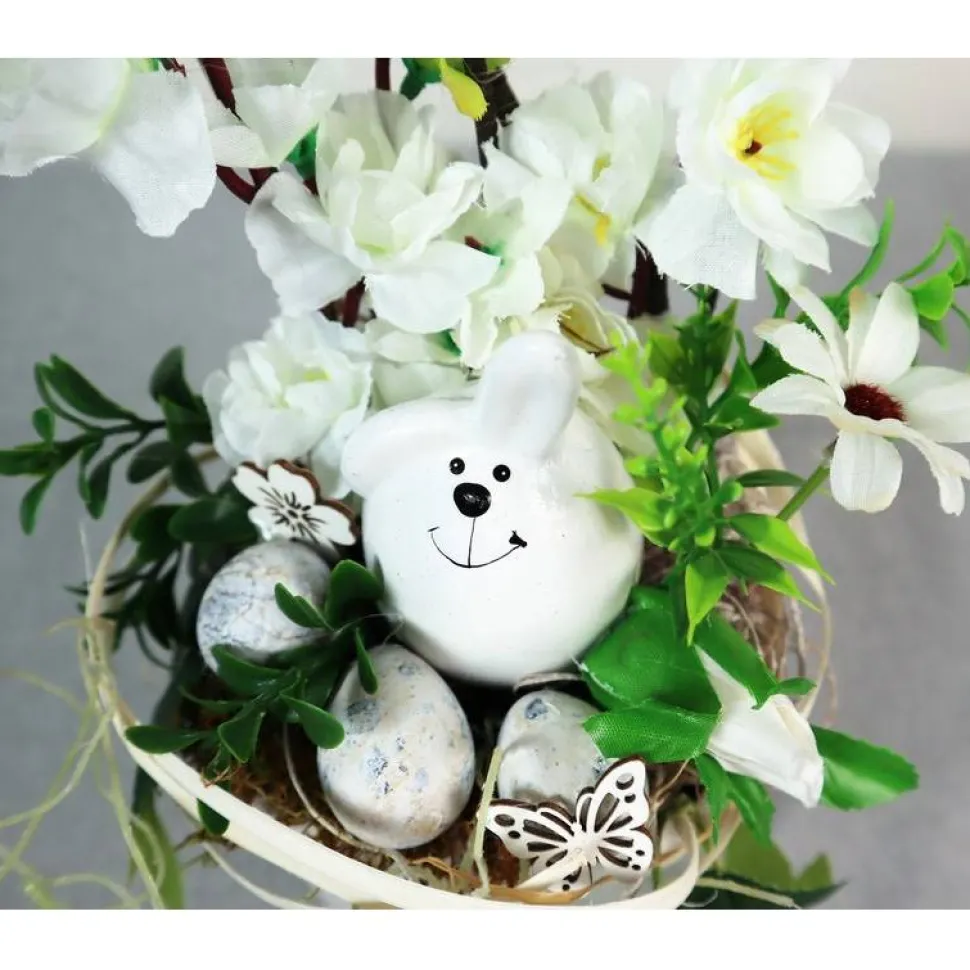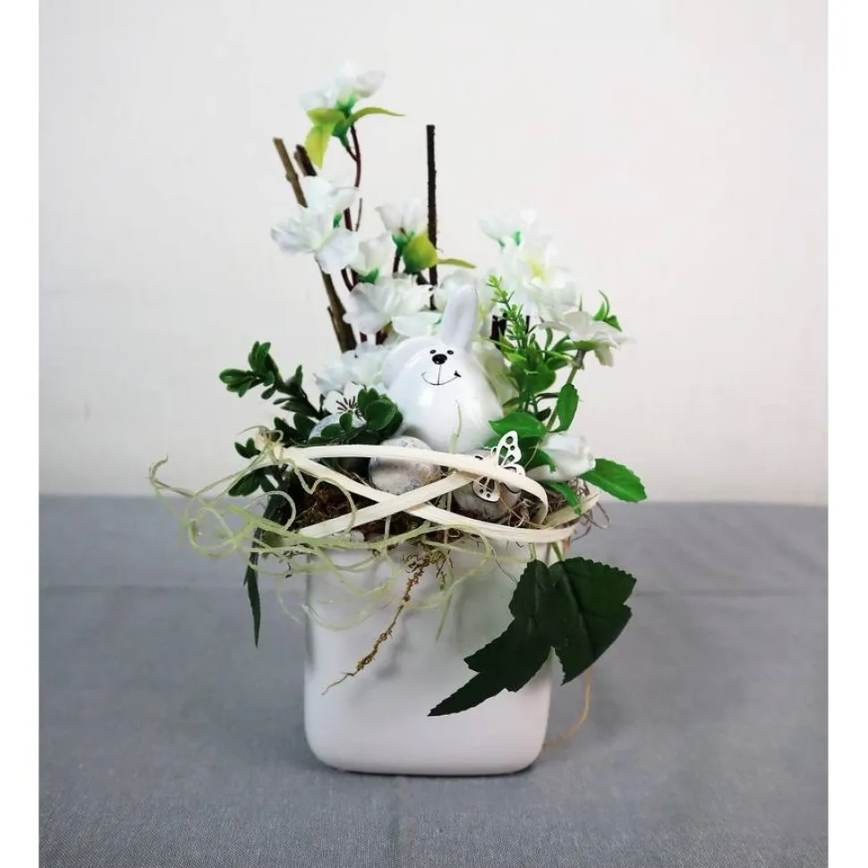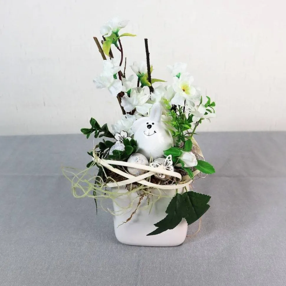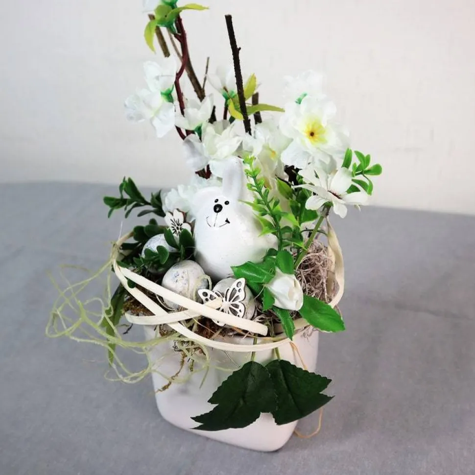 Material: Keramikschale, künstliche Blüten und Grün, Keramikhase, Naturdekorationen