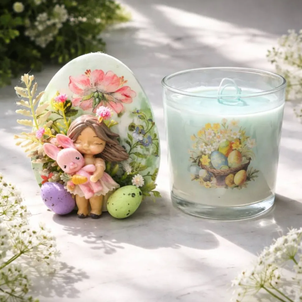 Kerze im Glas und ein Osterei mit aufwendiger handgemachter Verzierung.