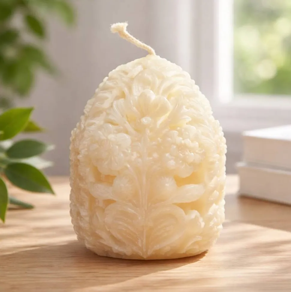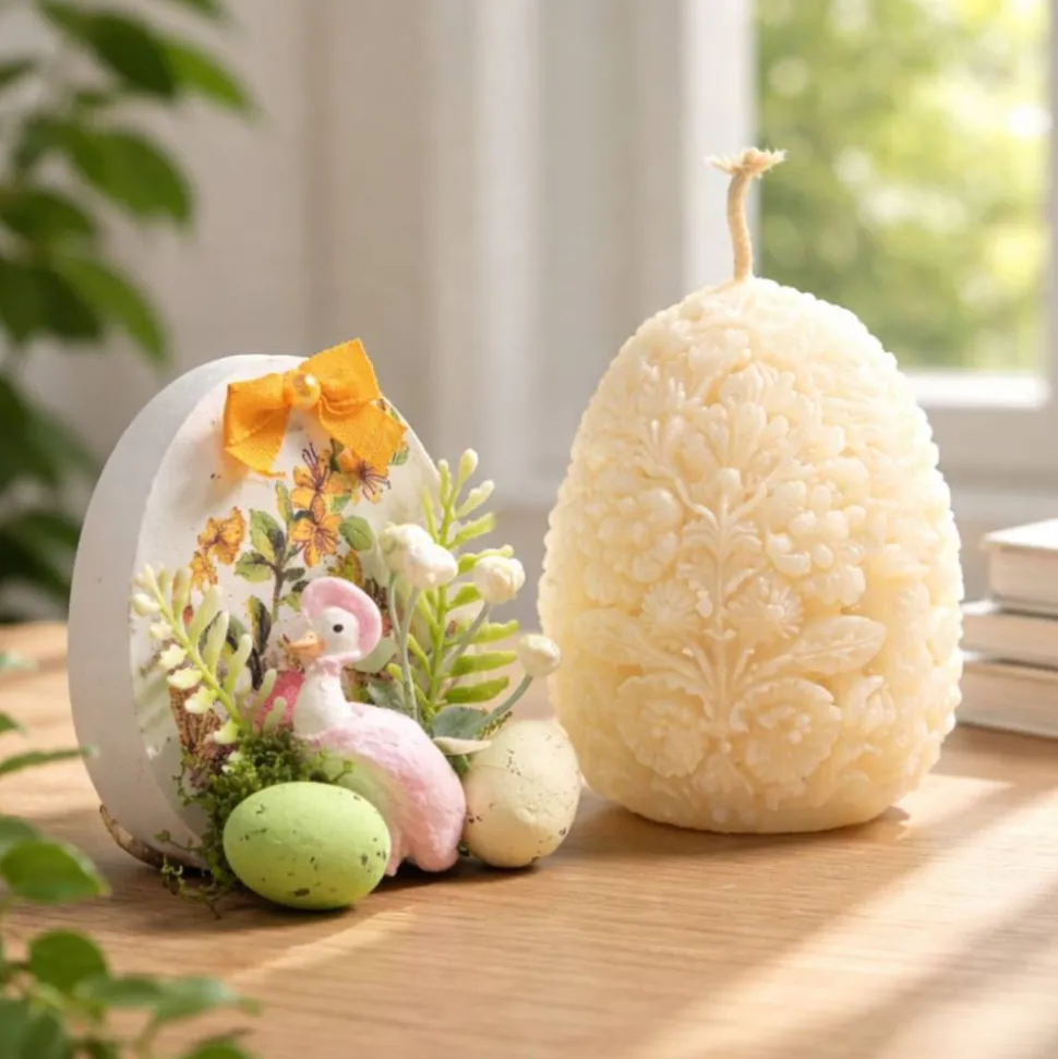 Kerze und ein Osterei mit aufwendiger handgemachter Verzierung.