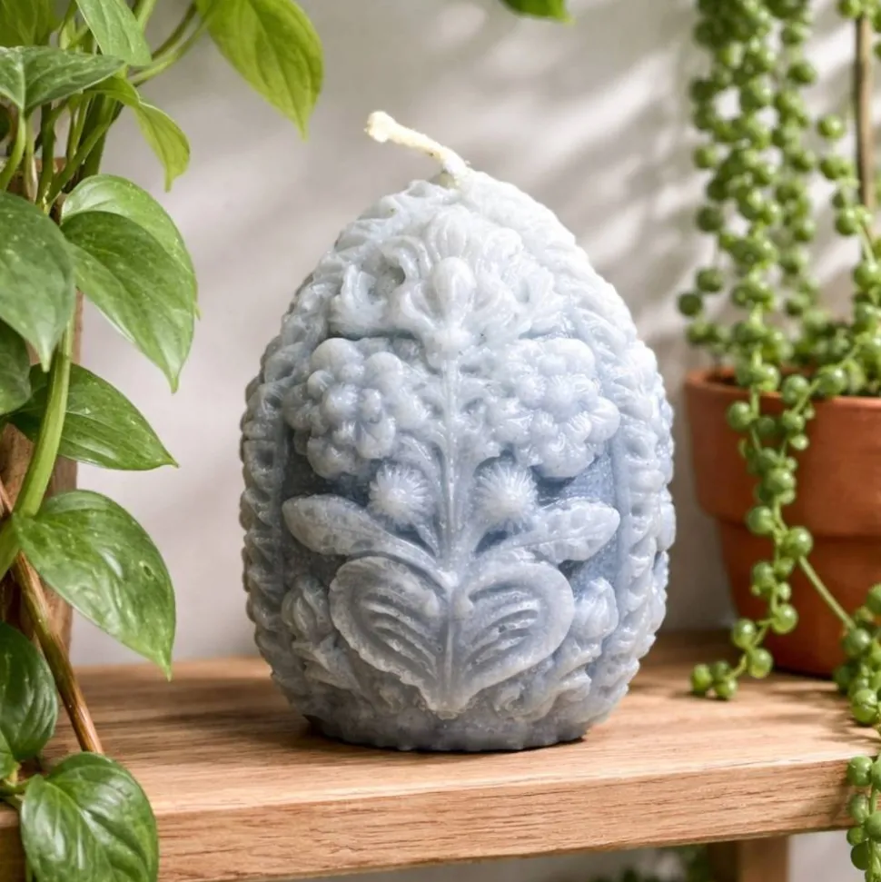 Kerze und ein Osterei mit aufwendiger handgemachter Verzierung.