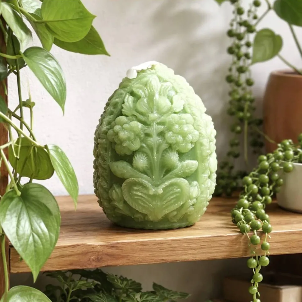 Kerze und ein Osterei mit aufwendiger handgemachter Verzierung.