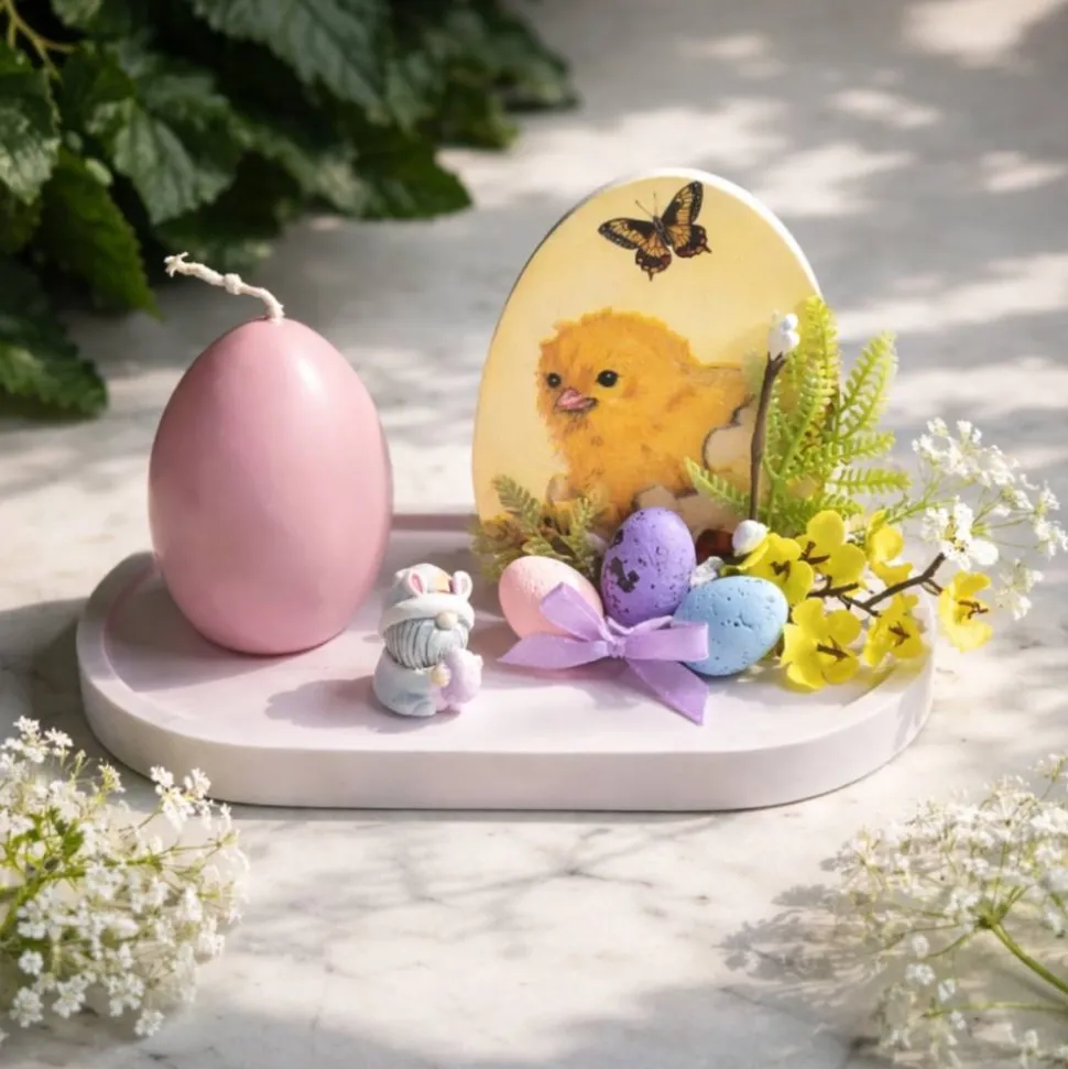 Auf einer Plattform steht ein großes, in Handarbeit geschmücktes und bemaltes Osterei, eine Ostereikerze (Handgegossen) und dazu ein niedlicher kleiner Zwerg.