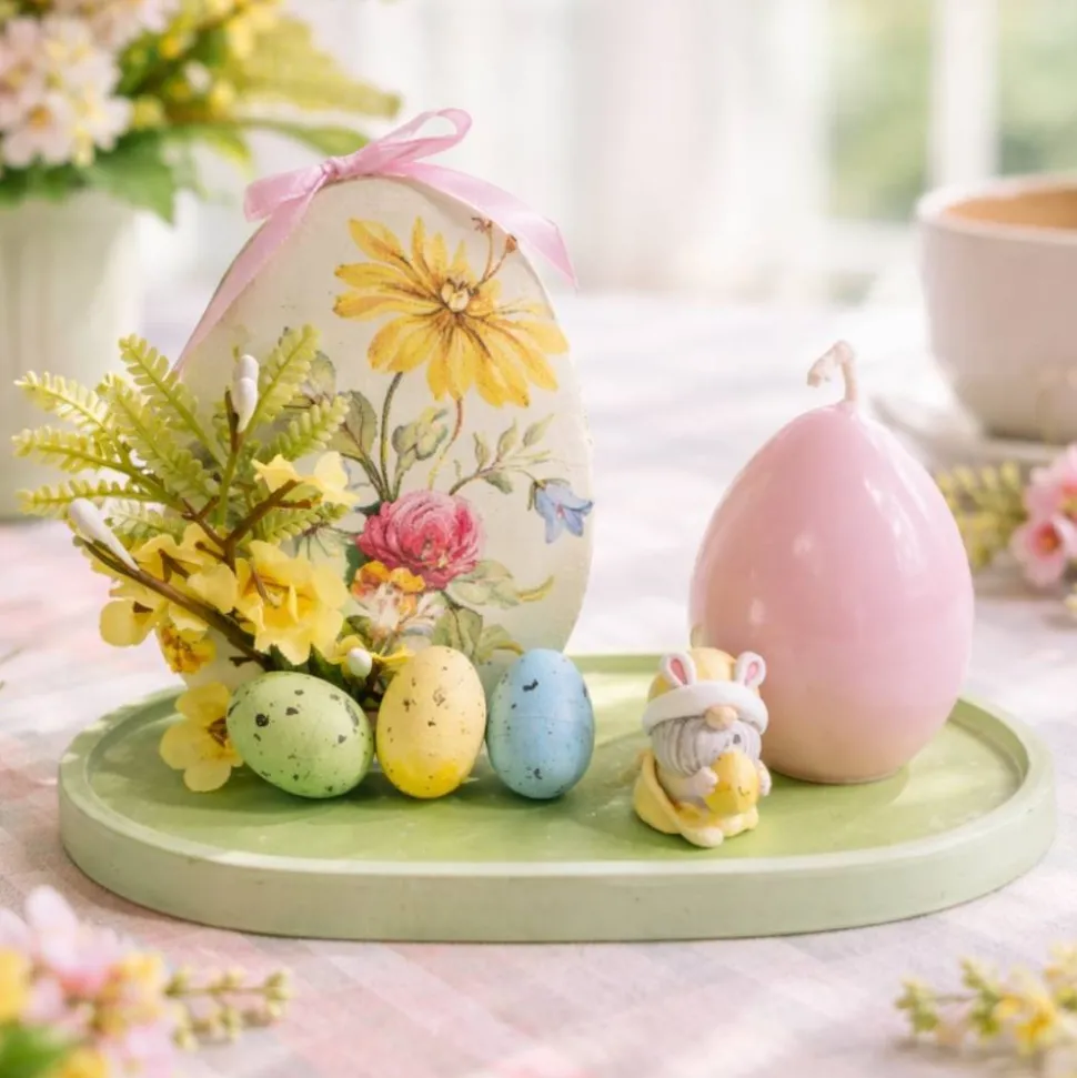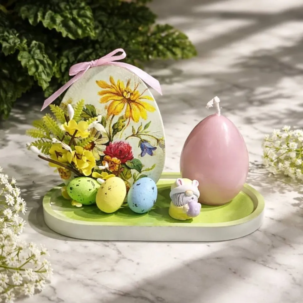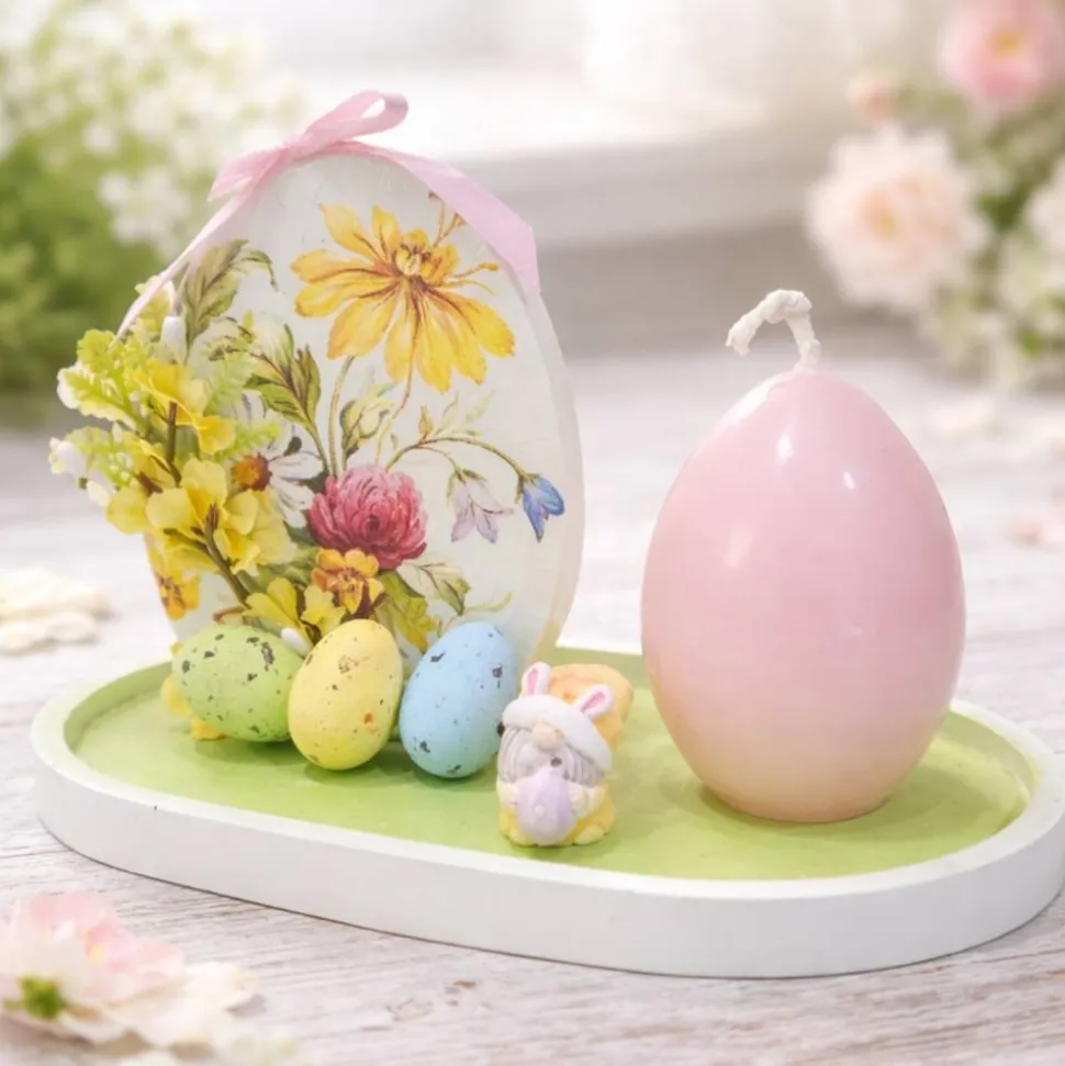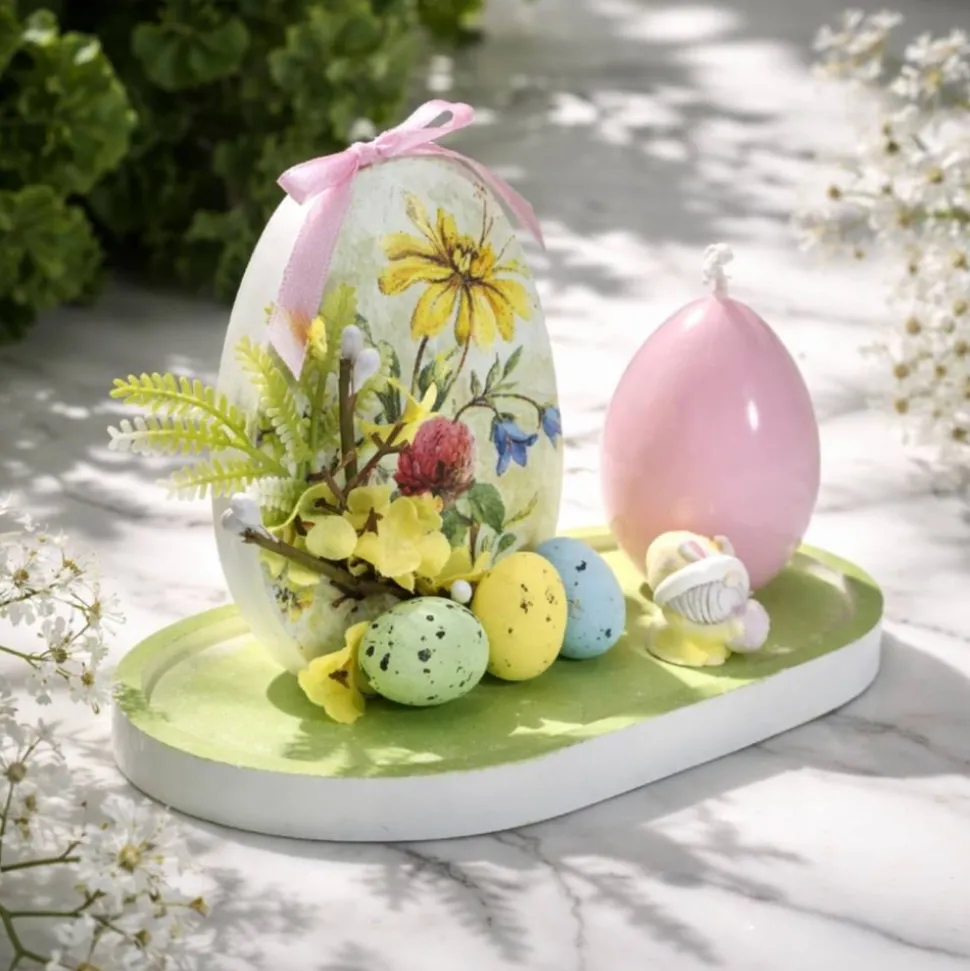 Auf einer Plattform steht ein großes, in Handarbeit geschmücktes und bemaltes Osterei, eine Ostereikerze (Handgegossen) und dazu ein niedlicher kleiner Zwerg.