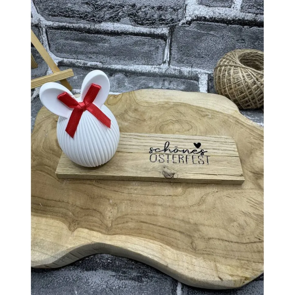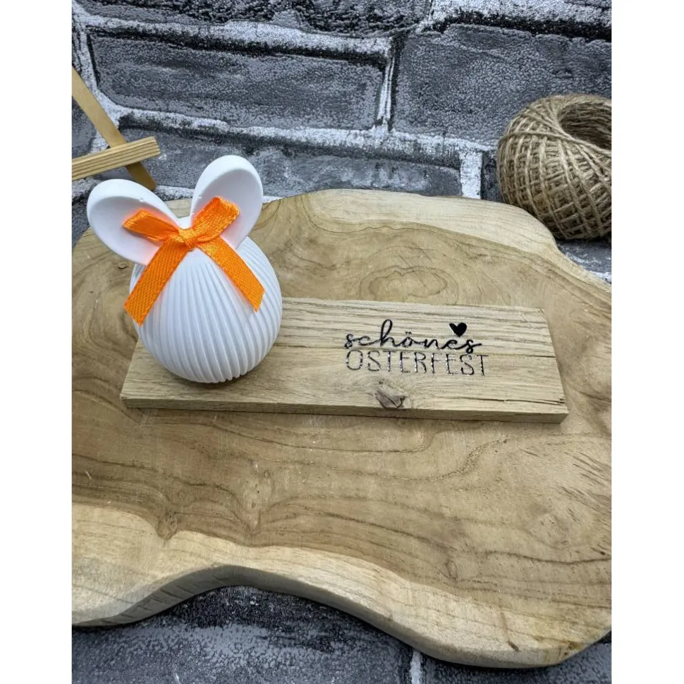 darauf ein Keramik gegossener Osterhase mit Schleiffchen.