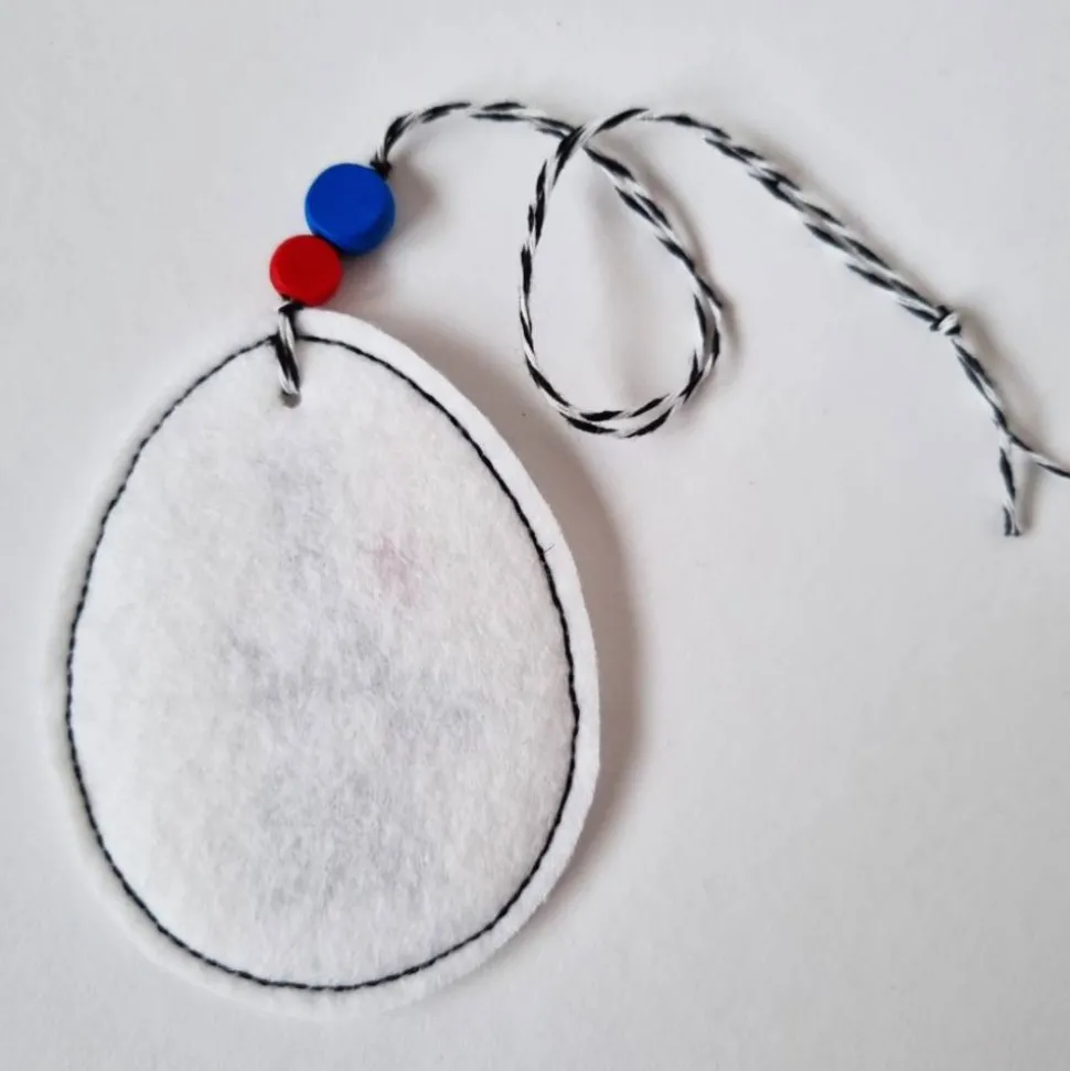 Das Osterei wurde aus doppeltem, gut 1,5 mm dickem Filz mit der Stickmaschine hergestellt (ITH), mit einem passenden schwarz-weißen Bändel zum Aufhängen versehen und mit zwei Holzperlen vervollständigt.