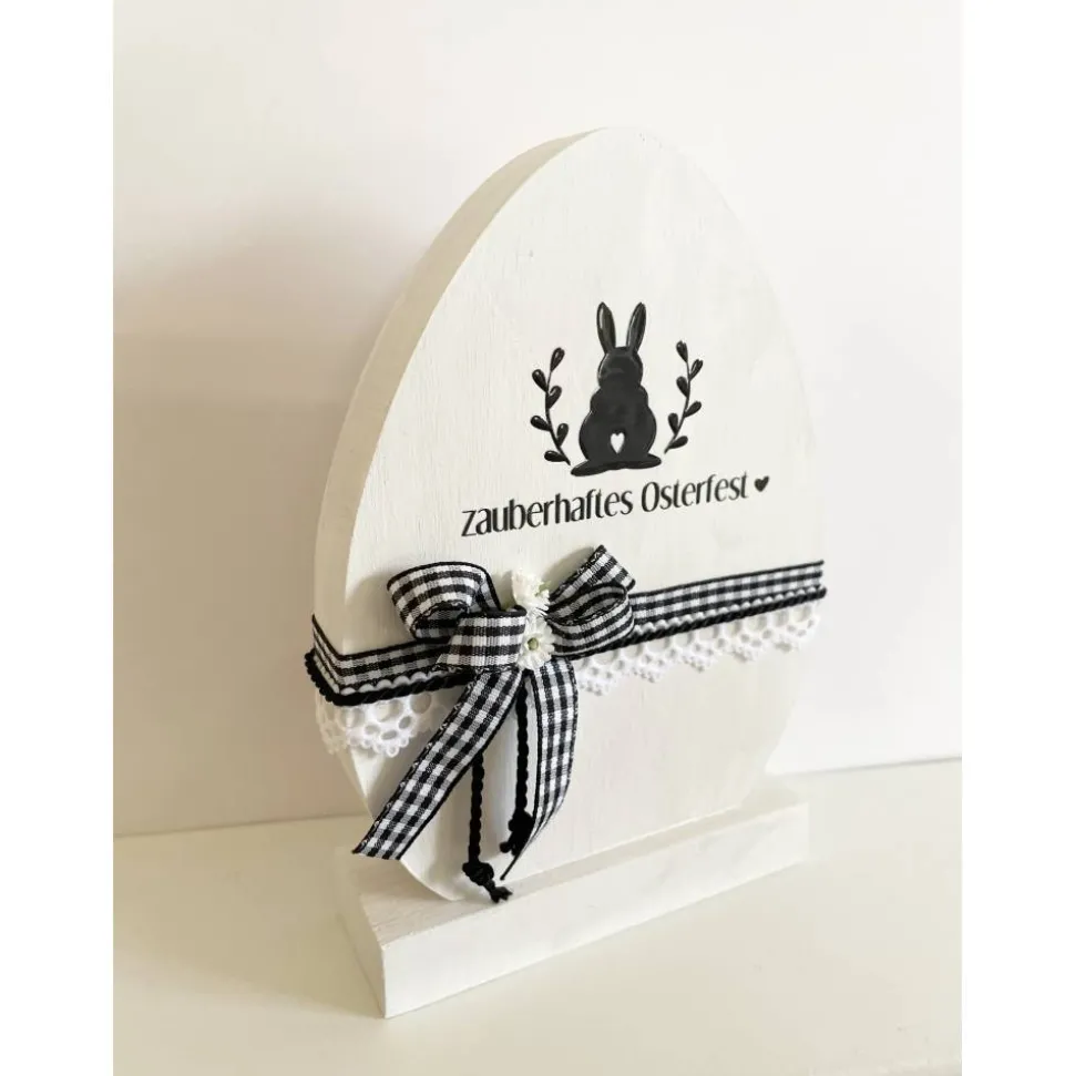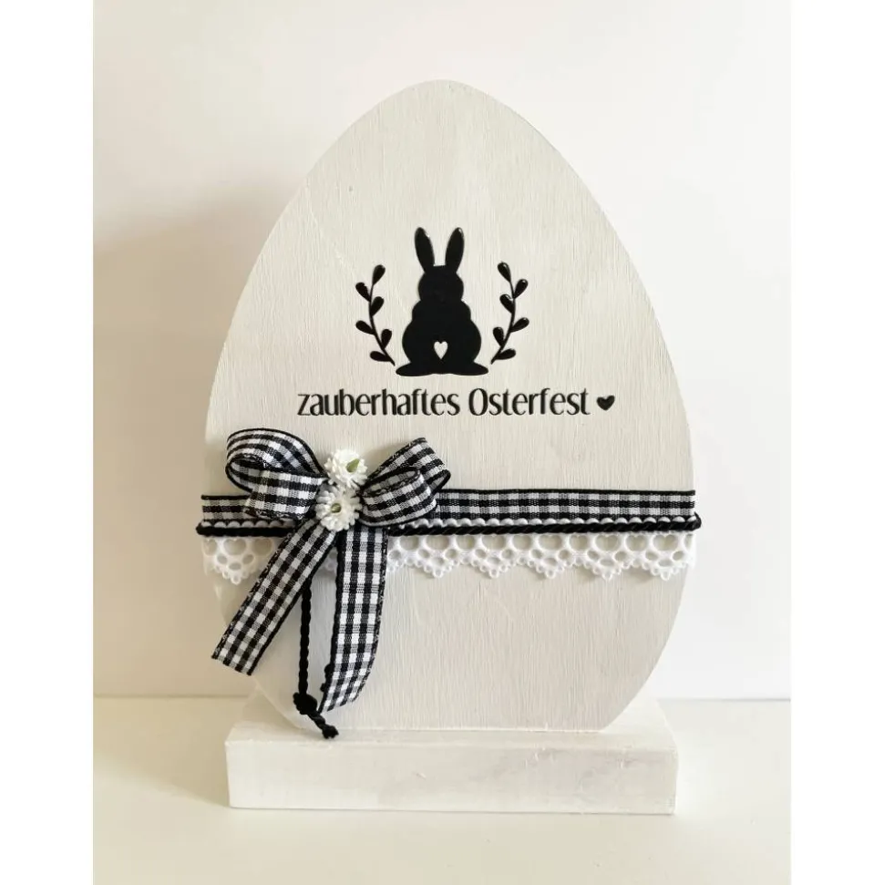 Verziert ist es mit einer schwarz/weiß karierten Schleife, einem weißen Spitzenband, einer schwarzen Kordel und
