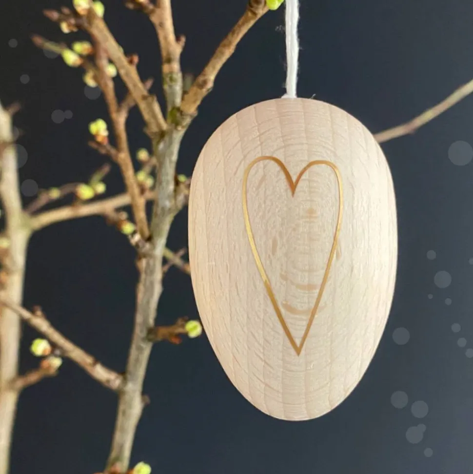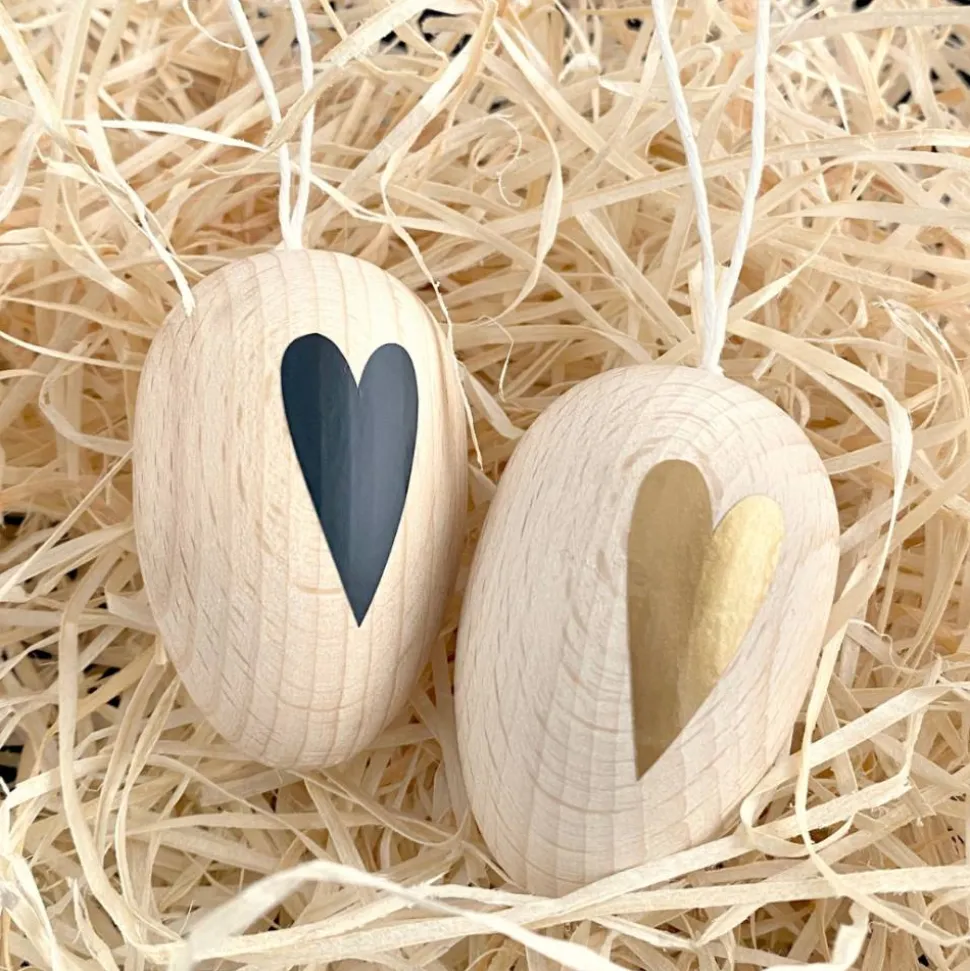 Das Holzei mit Herz-Motiv bekommst du in zwei Dekor-Varianten jeweils in Matt-Schwarz oder Metallic-Gold.