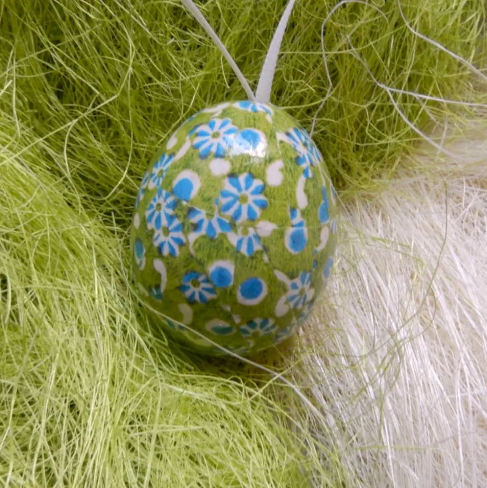 Es ist ca. 4 cm also Größe L (ausschließlich Freilandeier) und hat einen cremefarbenes Seidenband zum aufhängen.