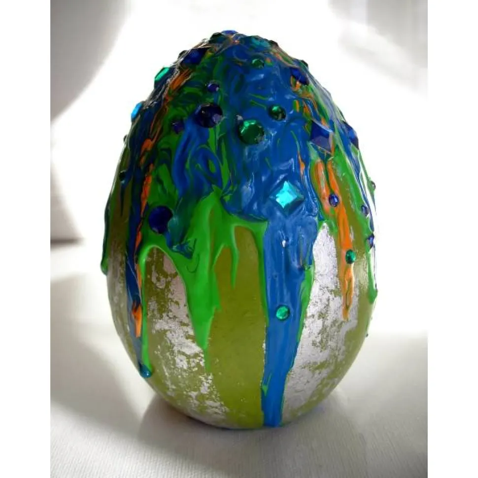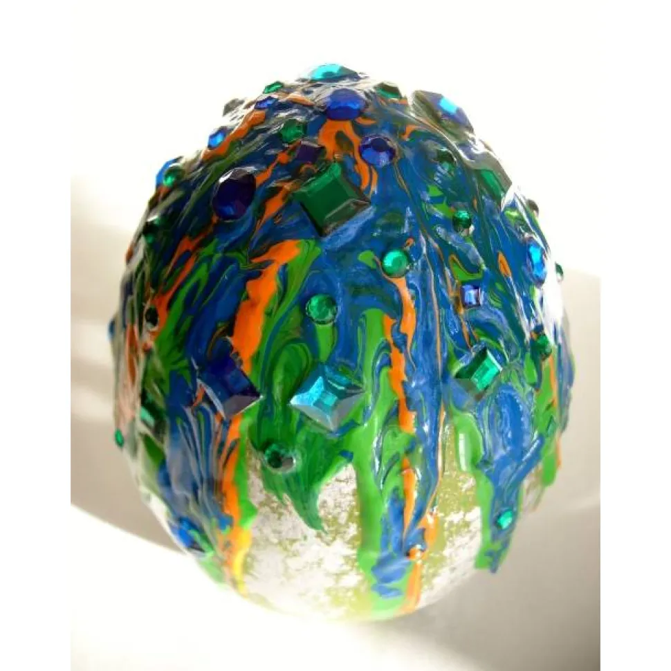 Verwendete Materialien: Acrylfarben auf einem Keramik-Ei, gestaltet mit Glitzersteinen und Blattmetall.