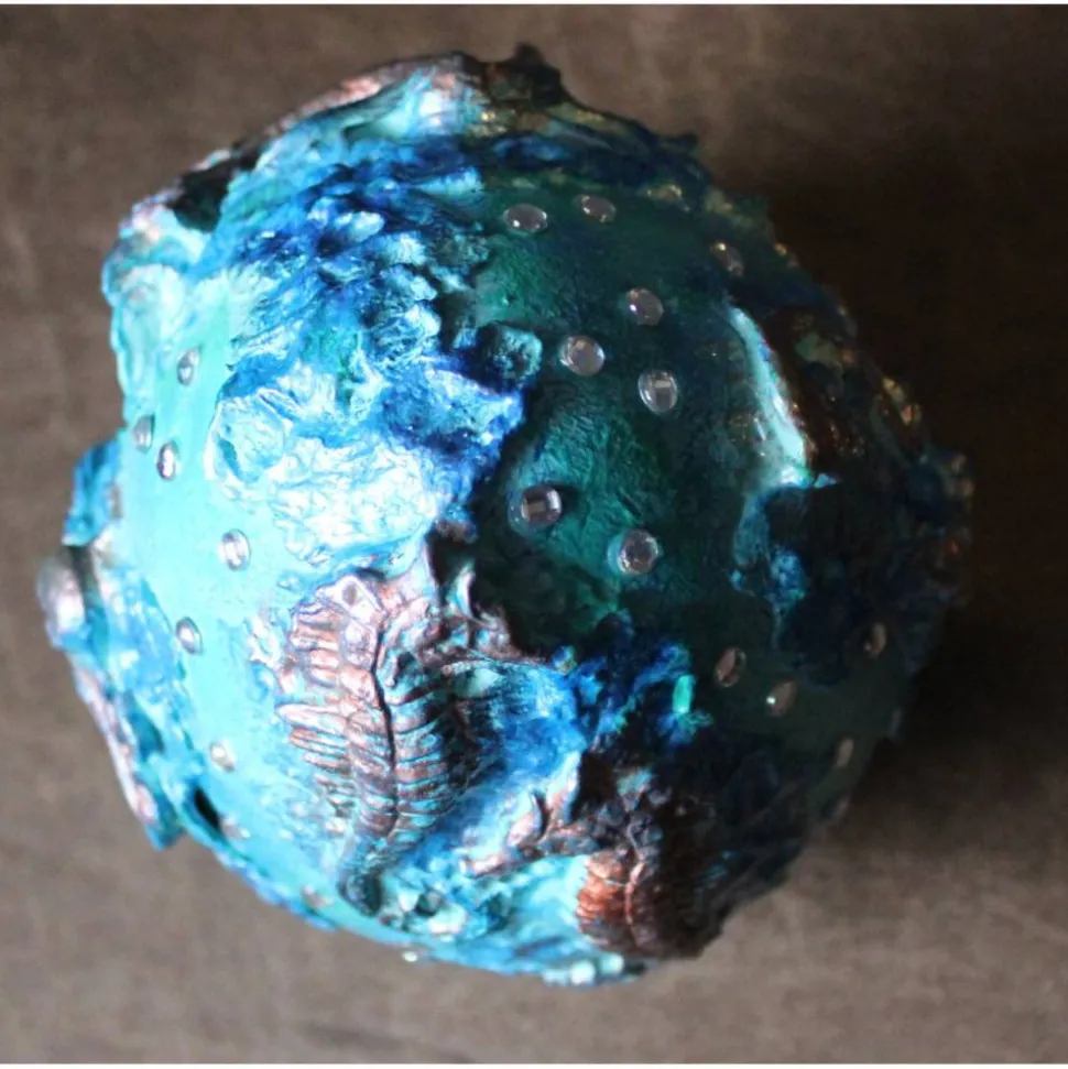 Deko-Ei aus Keramik im maritimen Stil. Verziert mit aus Modelliermasse geformten Seepferdchen, Octopus, Meerjungfrau und diversen Ornamenten. Mit Glitzersteinen und Acrylfarben gestaltet, witziges Künstler-Ei der etwas anderen Art! Tolle Vintage-Effekte durch Verwendung von kupfernen Effekten und Rissbildung in der Farbe.