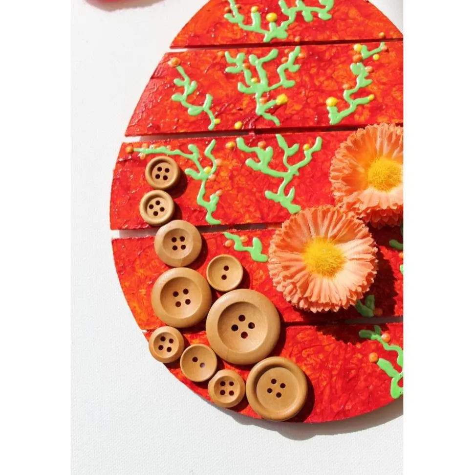 Mit Blüten, Acrylfarben und Holzknöpfen verziert.