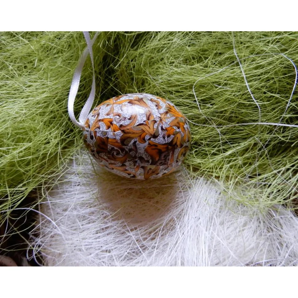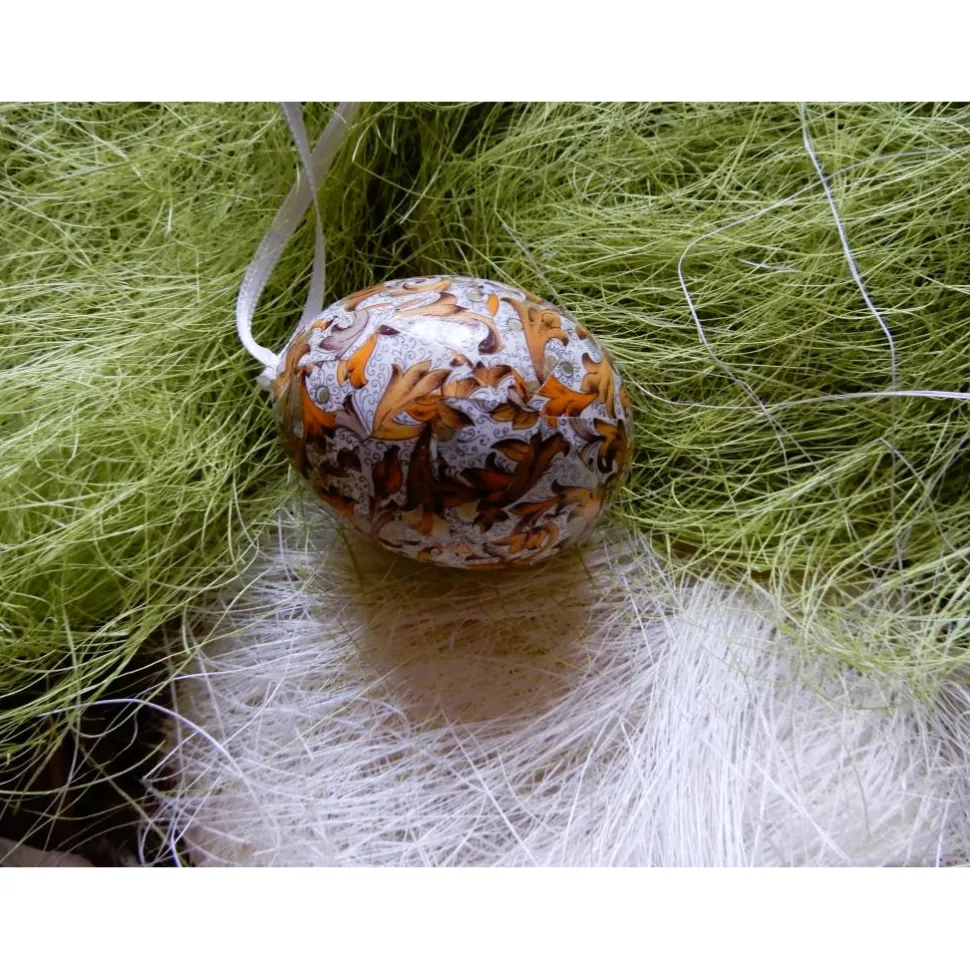 Es ist ca. 4 cm also Größe L (ausschließlich Freilandeier) und hat einen cremefarbenes Seidenband zum aufhängen.