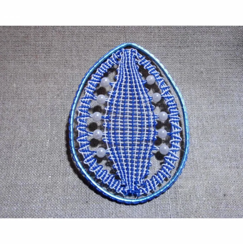 Die Klöppelarbeit wurde in einen Drahtrahmen eingenäht. Oben am Rahmen ist ein dünner Nylonfaden angebracht, damit Sie das Osterei an Ihren Osterstrauß hängen können.