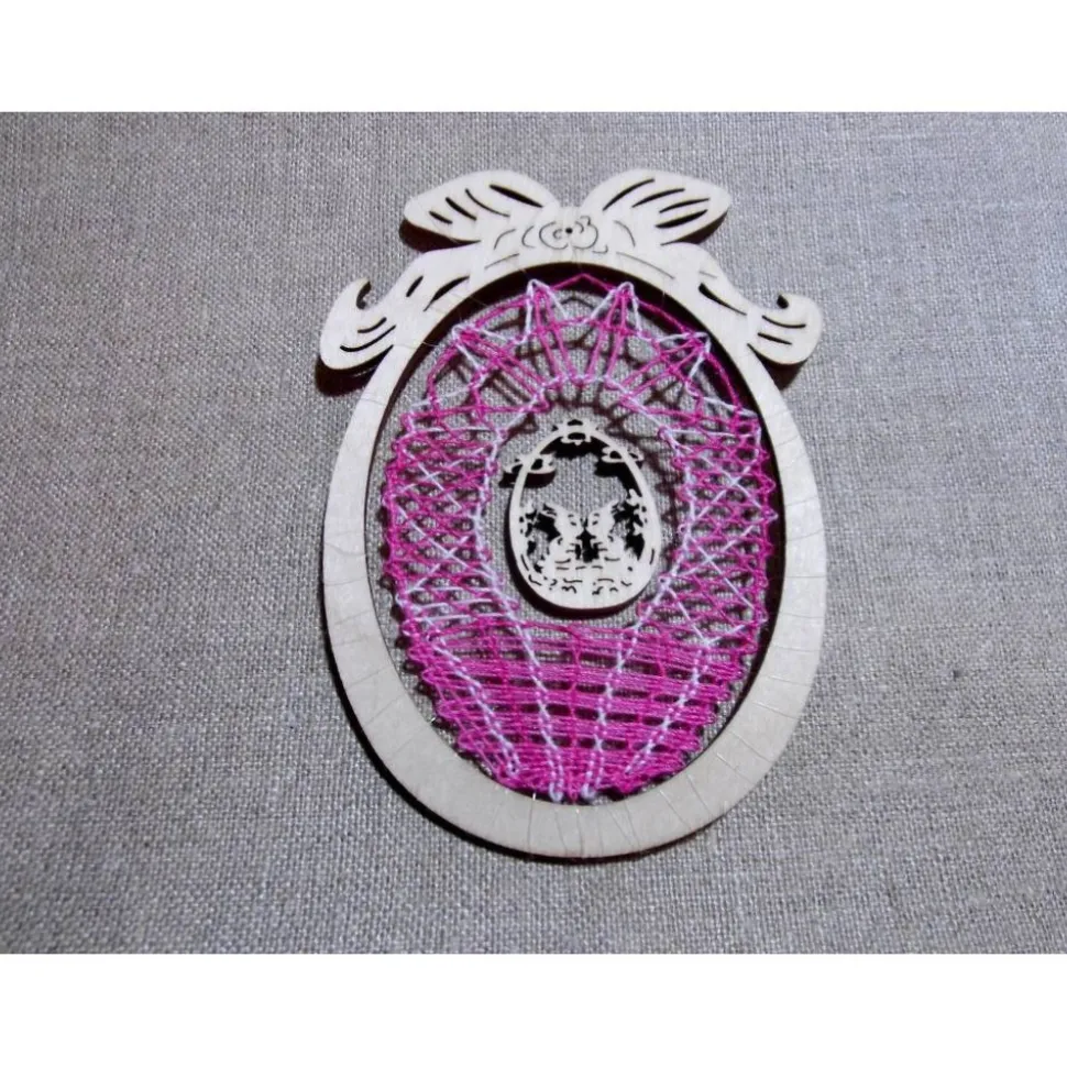 Für diese Osterdekoration habe ich Ostereier aus rosa-weißmeliertem Baumwollgarn von Hand geklöppelt. Diese Klöppelarbeiten nähte ich in einen fertig gekauften Holzrahmen in Ostereiform ein. In der Mitte der Ostereier hängt jeweils ein kleines österliches Holzmotiv, welches ich fertig gekauft habe.