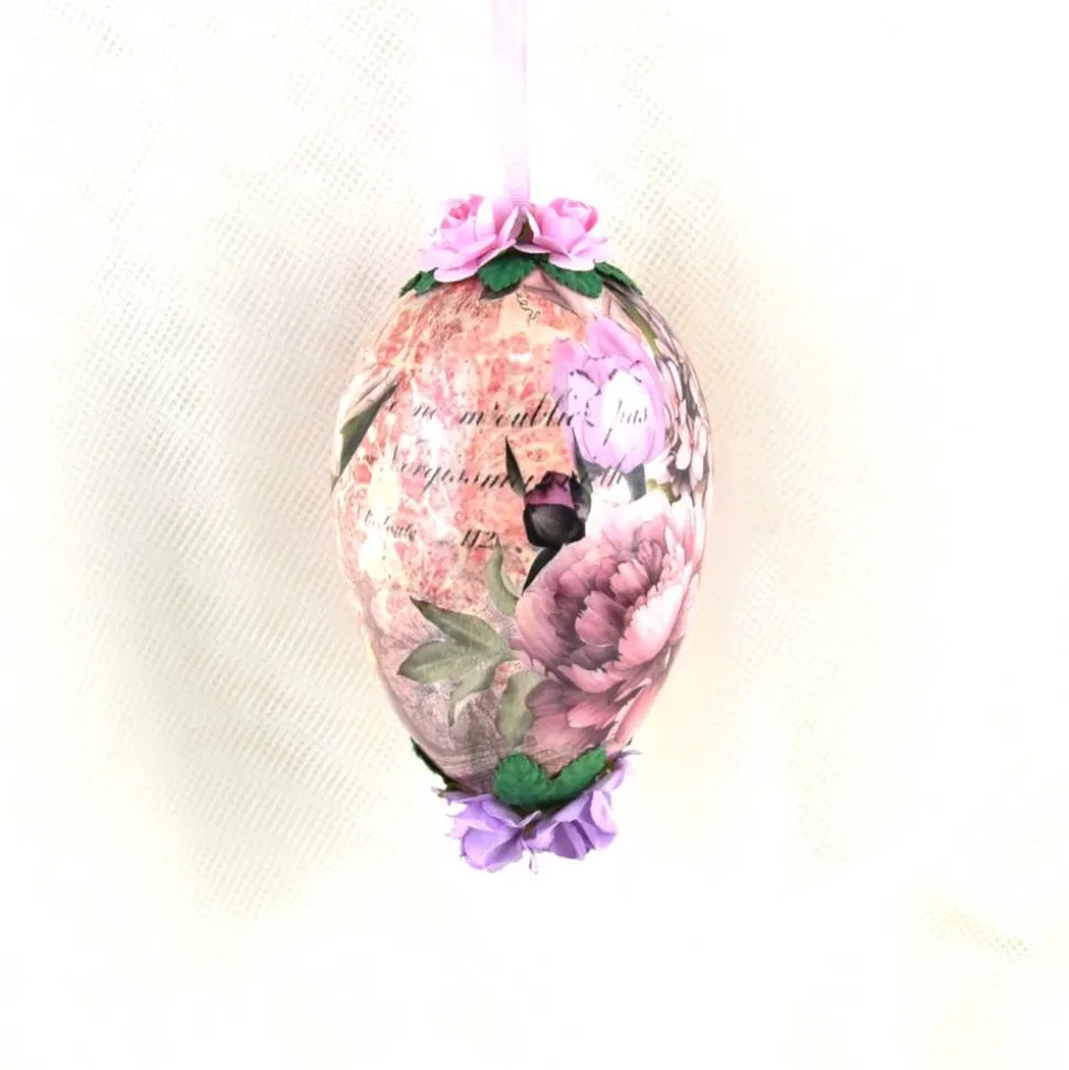 Das Osterei ist aus Kunststoff und mit einer Banderole überzogen. Es wurde mit Papierblumen und Papierblättern dekoriert. Es hat ein Satinband zum Aufhängen.