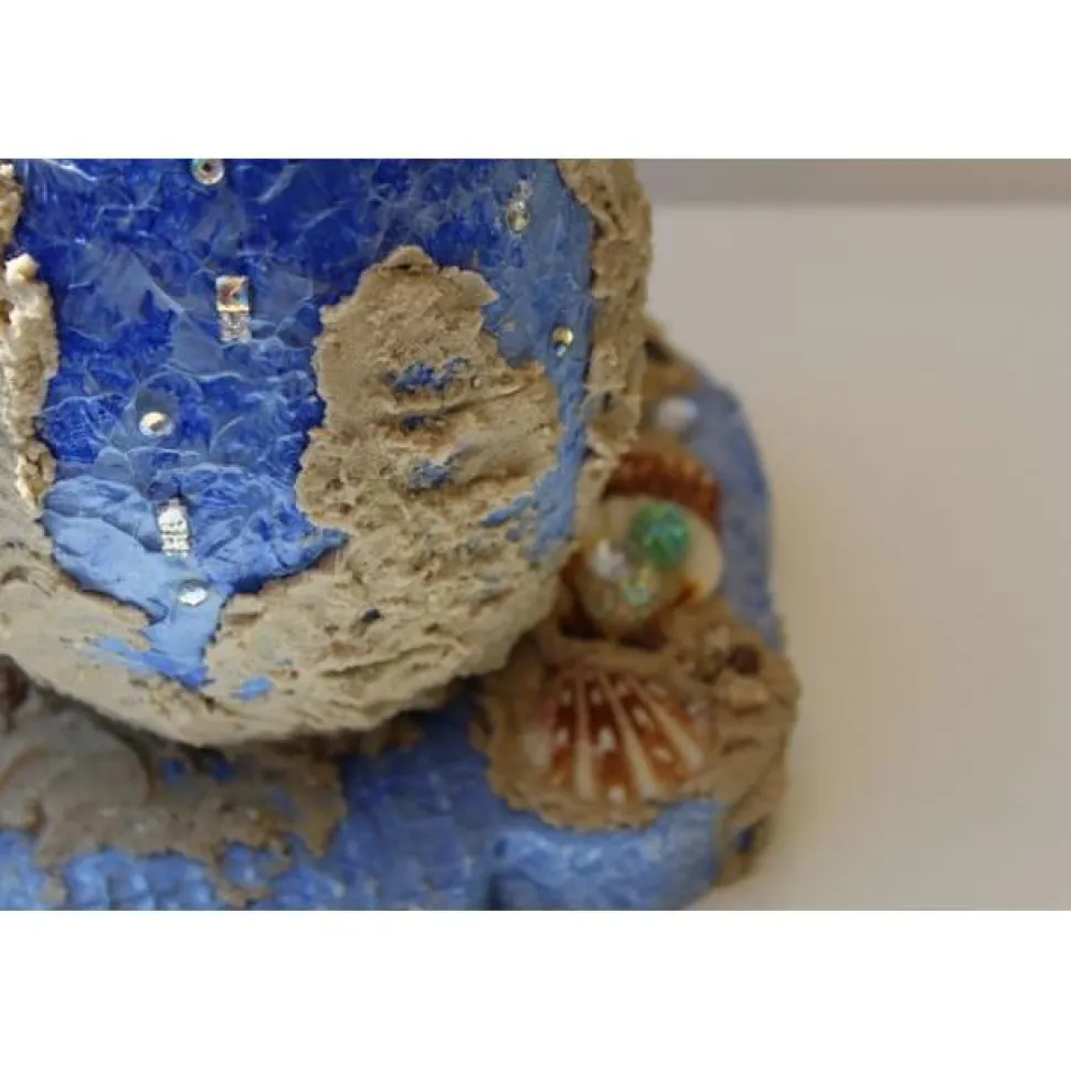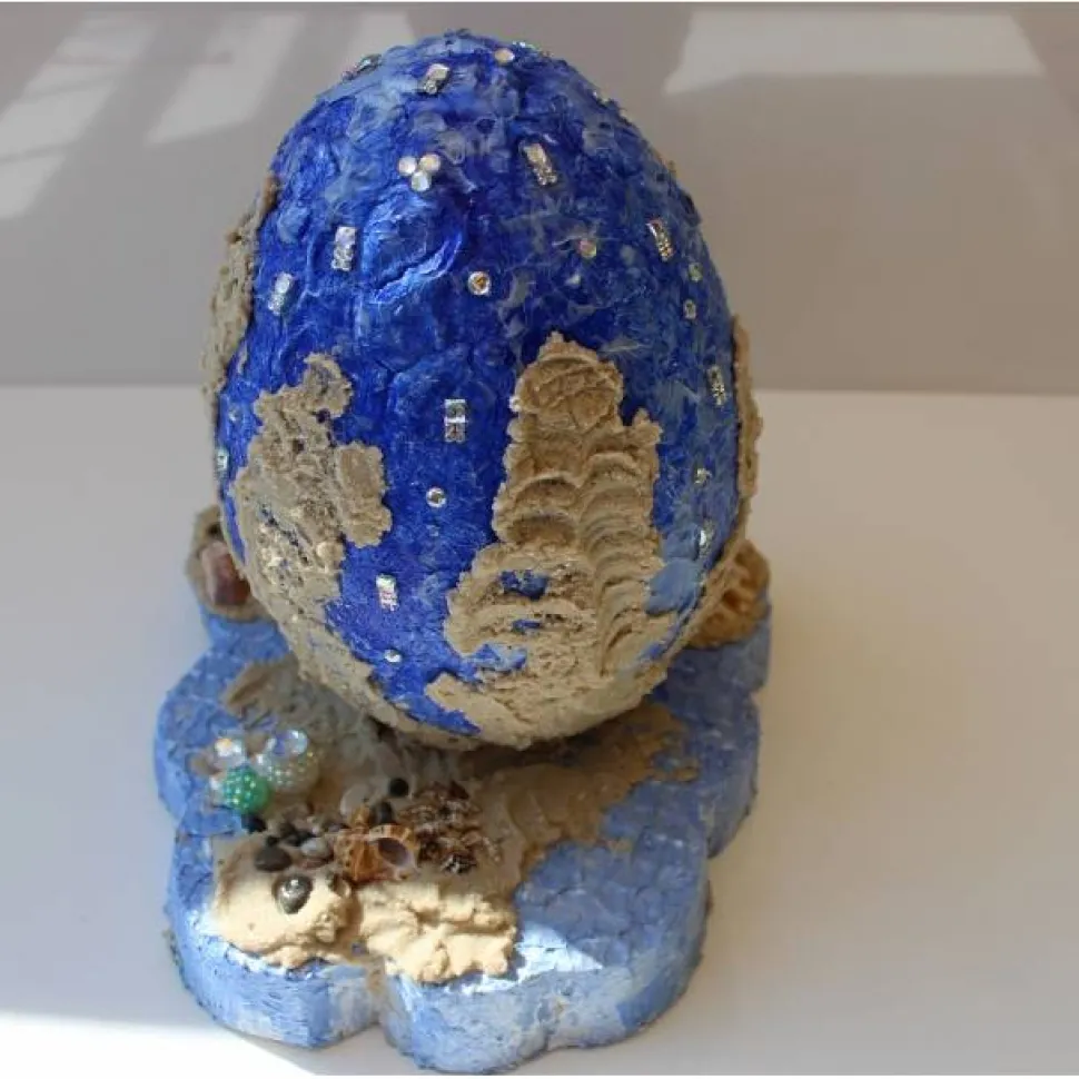 Maritimes Deko-Ei aus Styropor, verziert mit Acrylfarben, Glitzersteinen, Perlen und Muscheln, befestigt auf einer kleinen Plattform. Tolle Effekte durch die Verwendung von Modelliermasse.