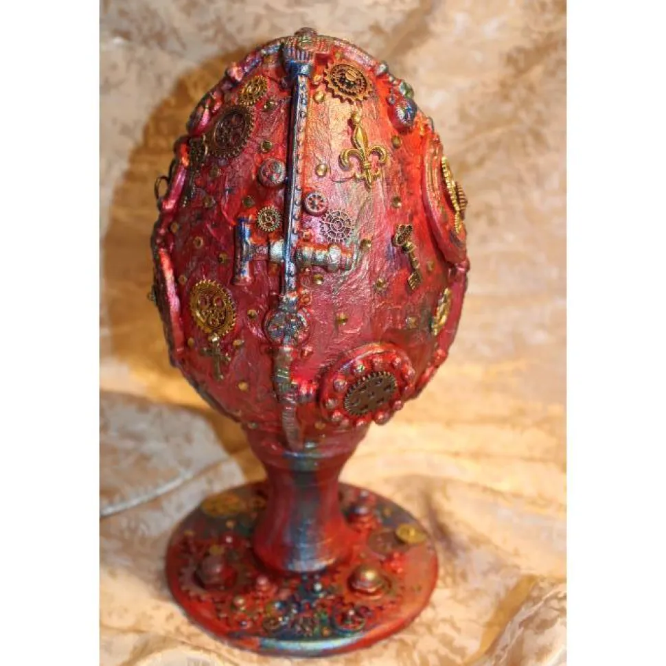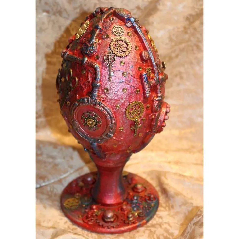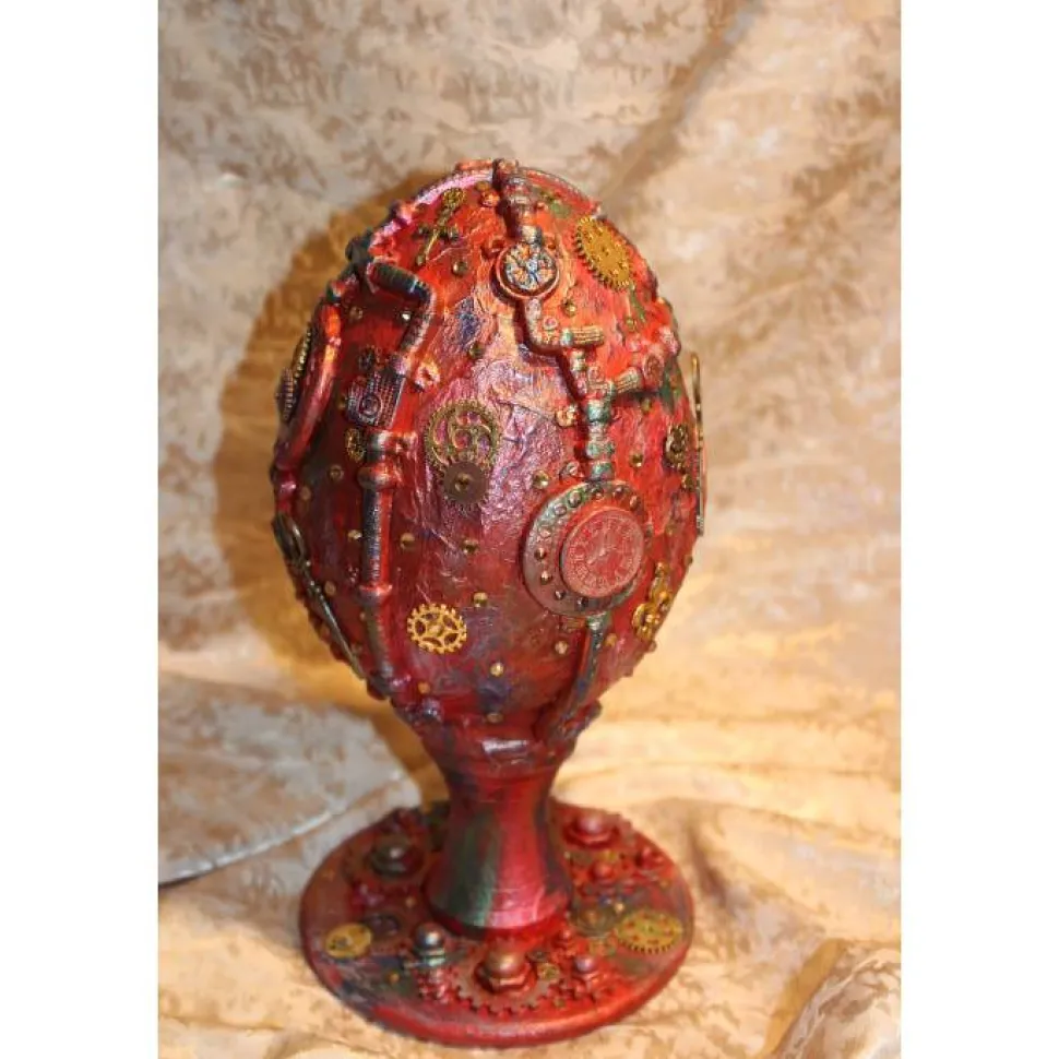 Kunststoffei mit Modelliermasse und Acrylfarben in Kupfer, Gold, Braun, Schwarz, Blau, Grün und Rot gestaltet.