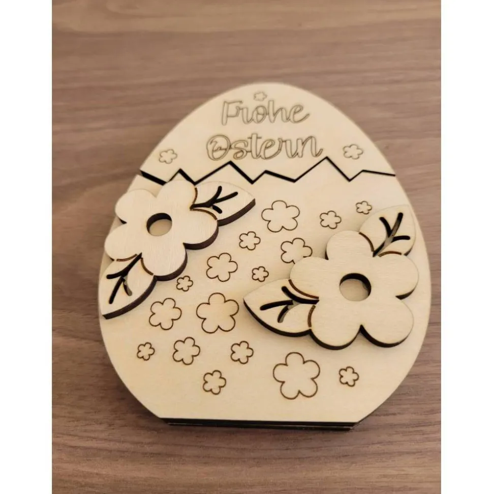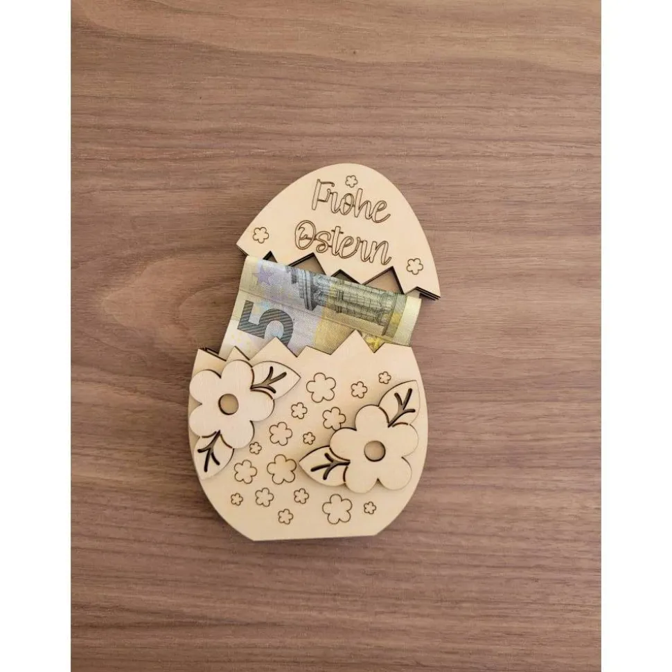 Das Ei ist mit modernen Lasertechniken graviert und gelasert. Auf Wunsch können wir auch einen persönlichen Namen auf der Rückseite verewigen. Der Deckel lässt sich leicht anheben, um den Geldschein sicher hineinzulegen.