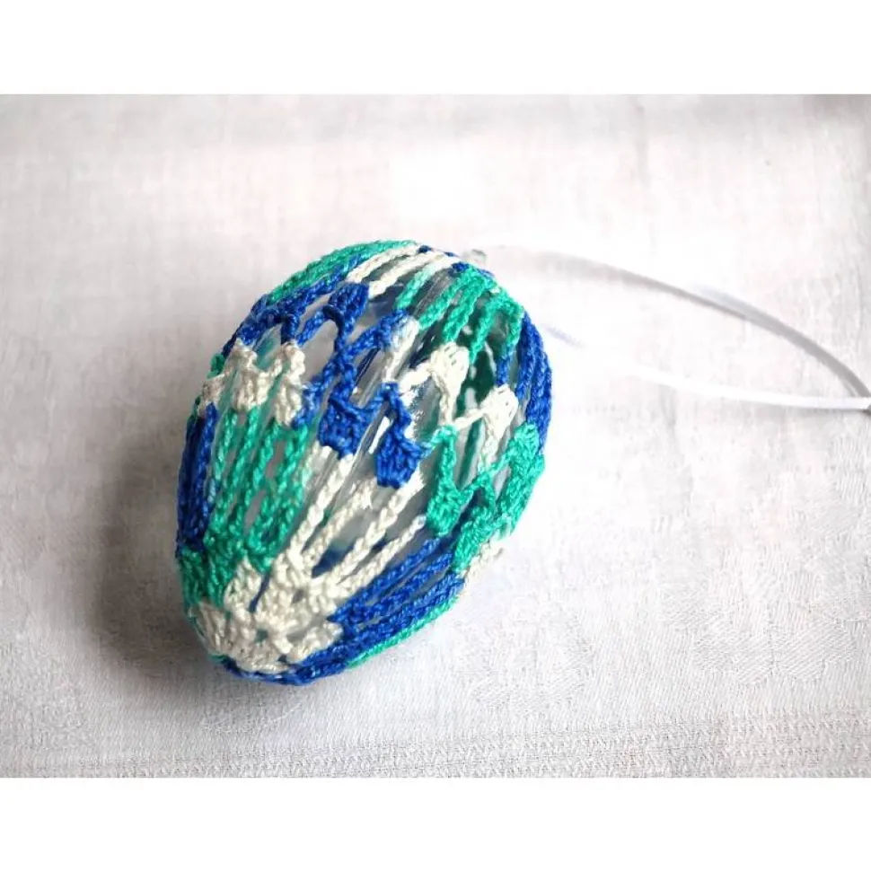 zauberhaftes, dekoratives Set aus zwei Häkeleiern aus weiß-blau-grünem Baumwollgarn. Mit einem Satinbändchen lässt sich das Ei an einen Osterstrauß, Kranz die Türklinke, Schrank oder ein kleines Geschenk anhängen. Ohne das Bändchen können sich die Eier auch zwischen anderen Osterdekos verstecken.