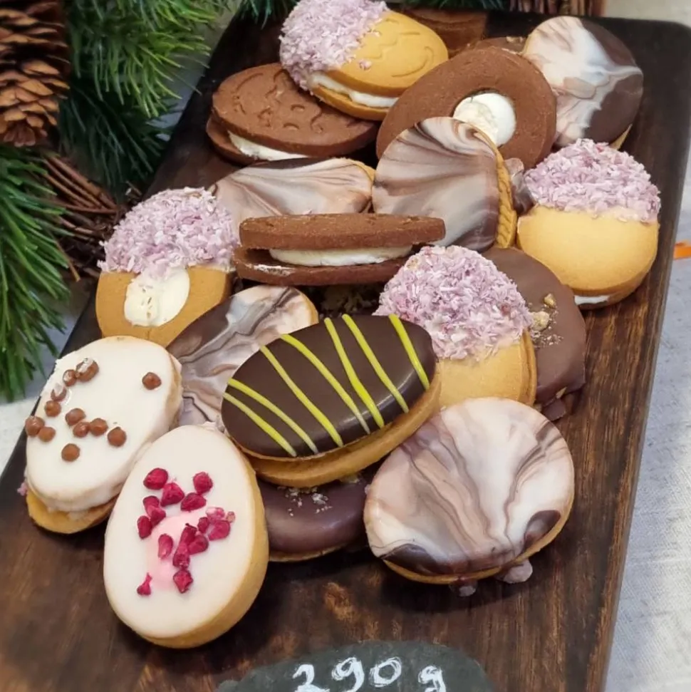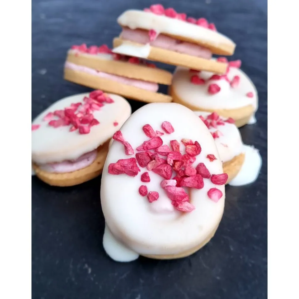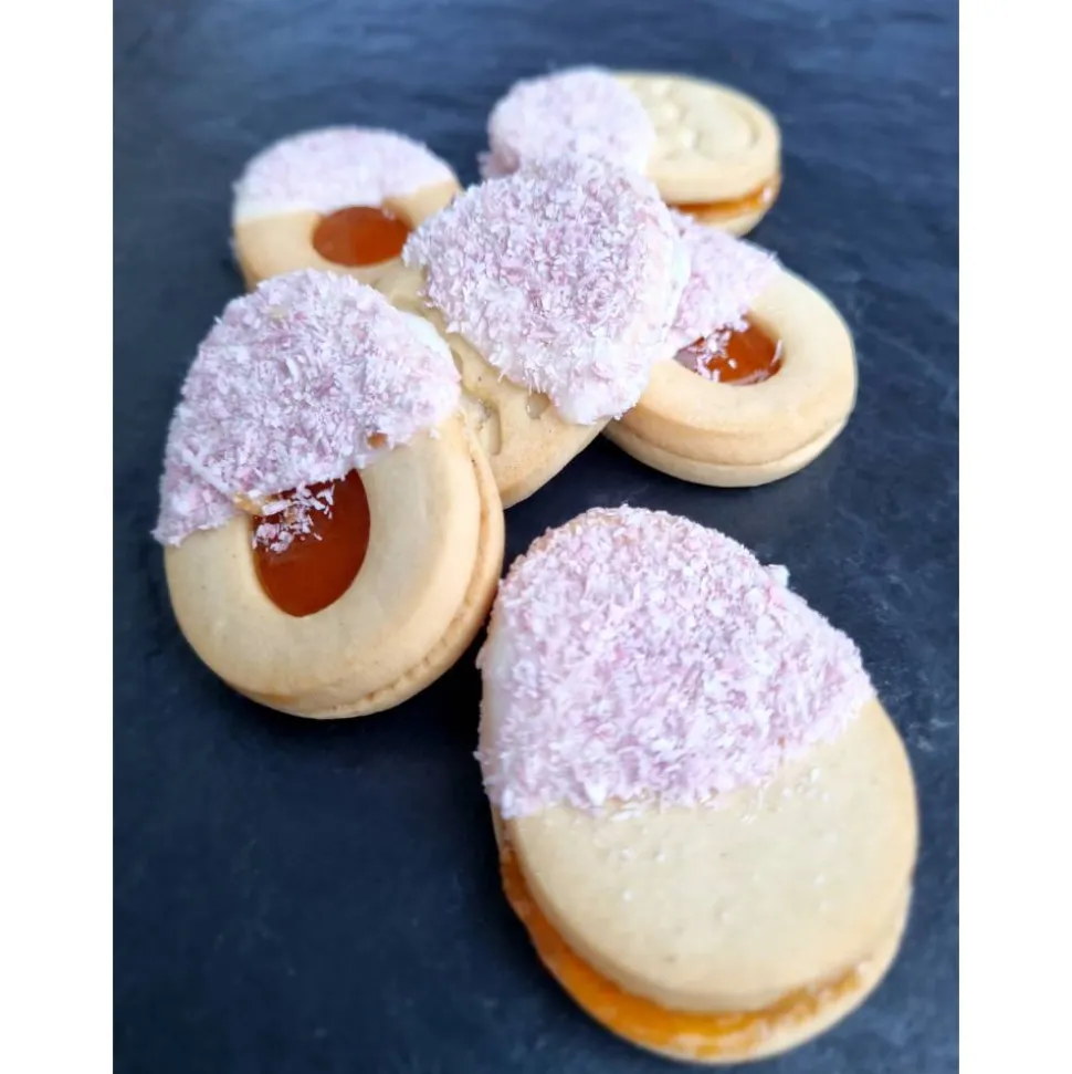 Eierlei Osterkekse biete diese herrliche Gebäckmischung mit 290g. Buttergebäck in Eierform, gefüllt mit köstlicher Himbeercreme, Aprikosenfüllung, herrlicher Kakaofüllung oder leckerer Haselnusscreme. Umhüllt mit heller oder dunkler Vollmilchschokolade oder auch marmoriert. Garniert mit Kokos, Himbeer- oder Krokrantplitter.