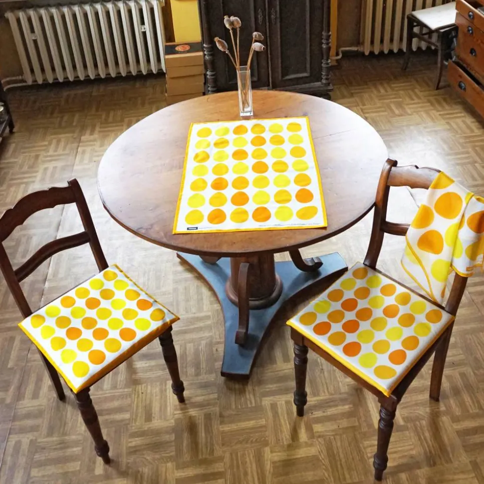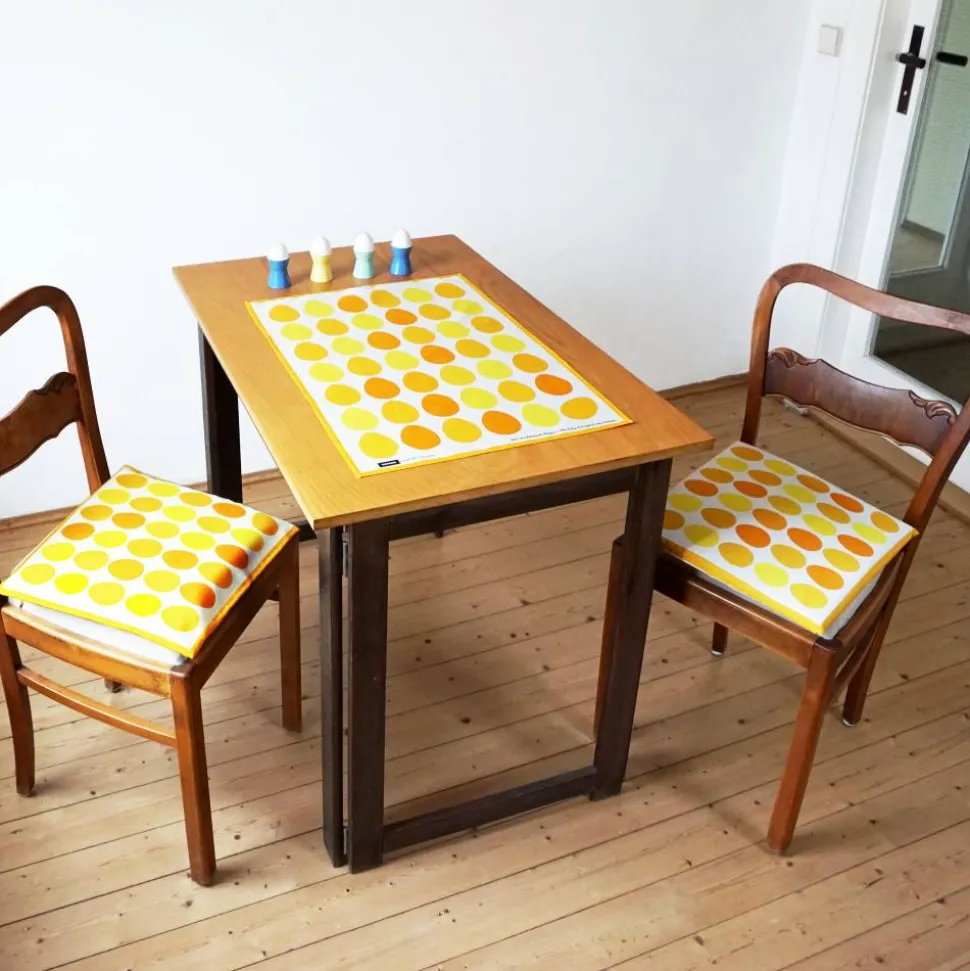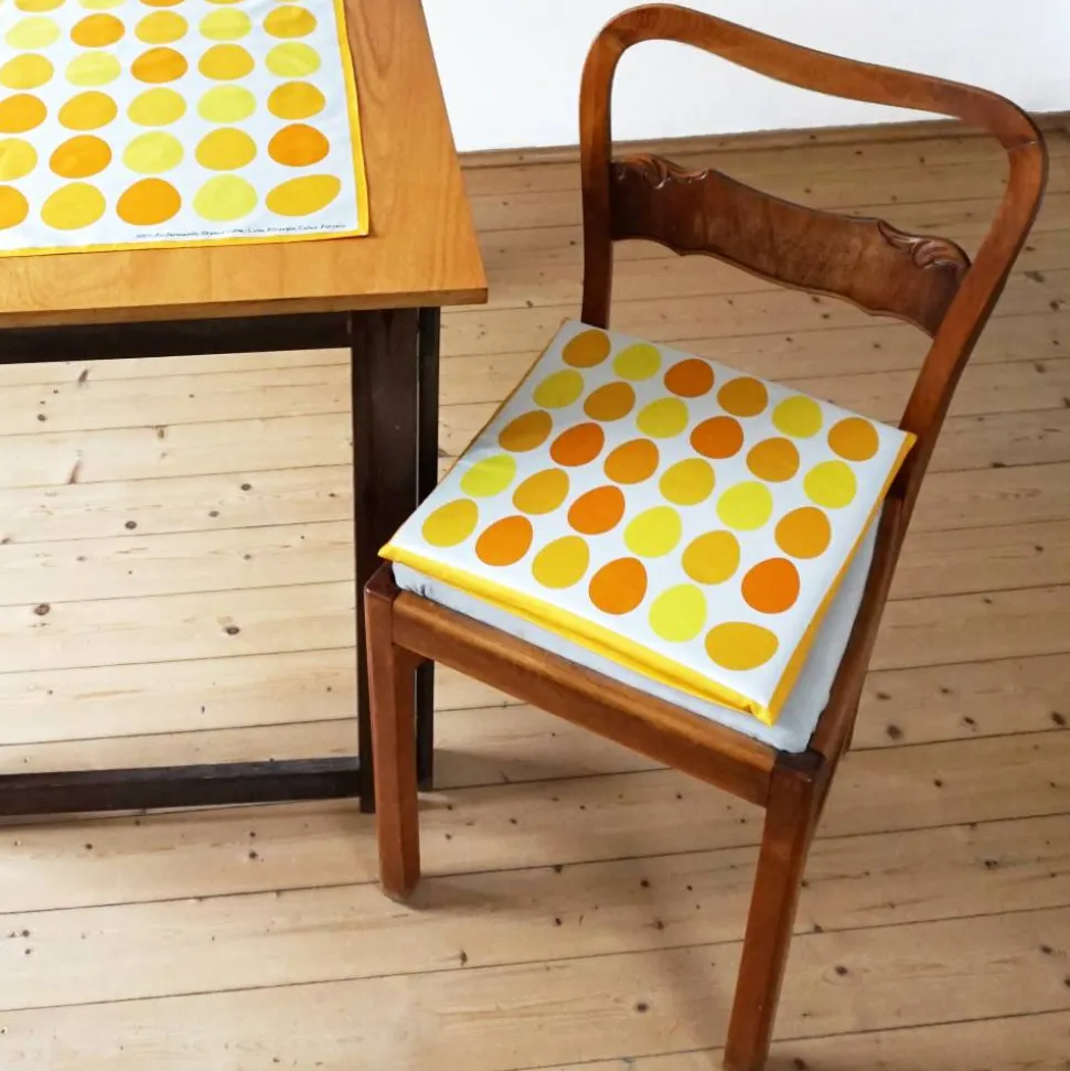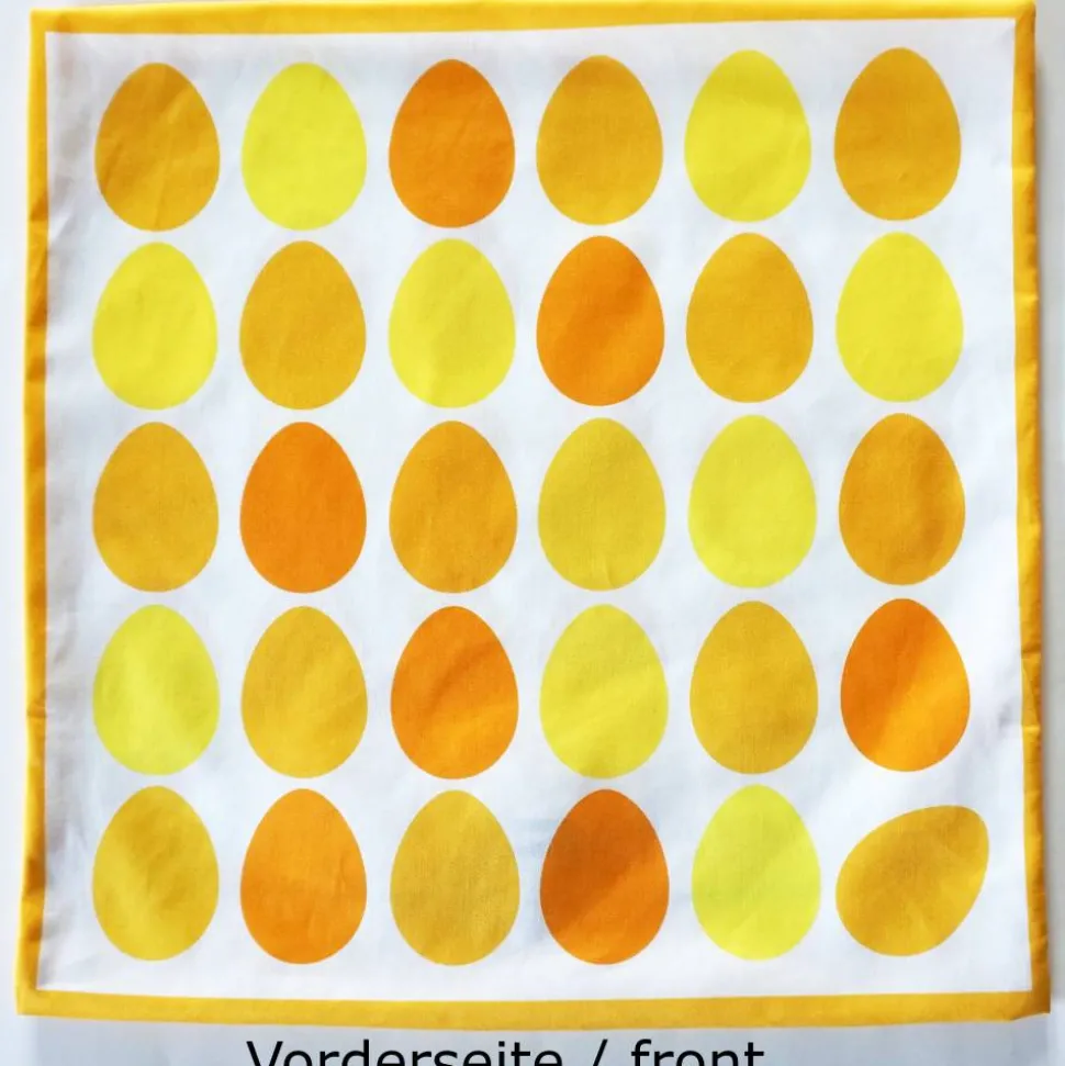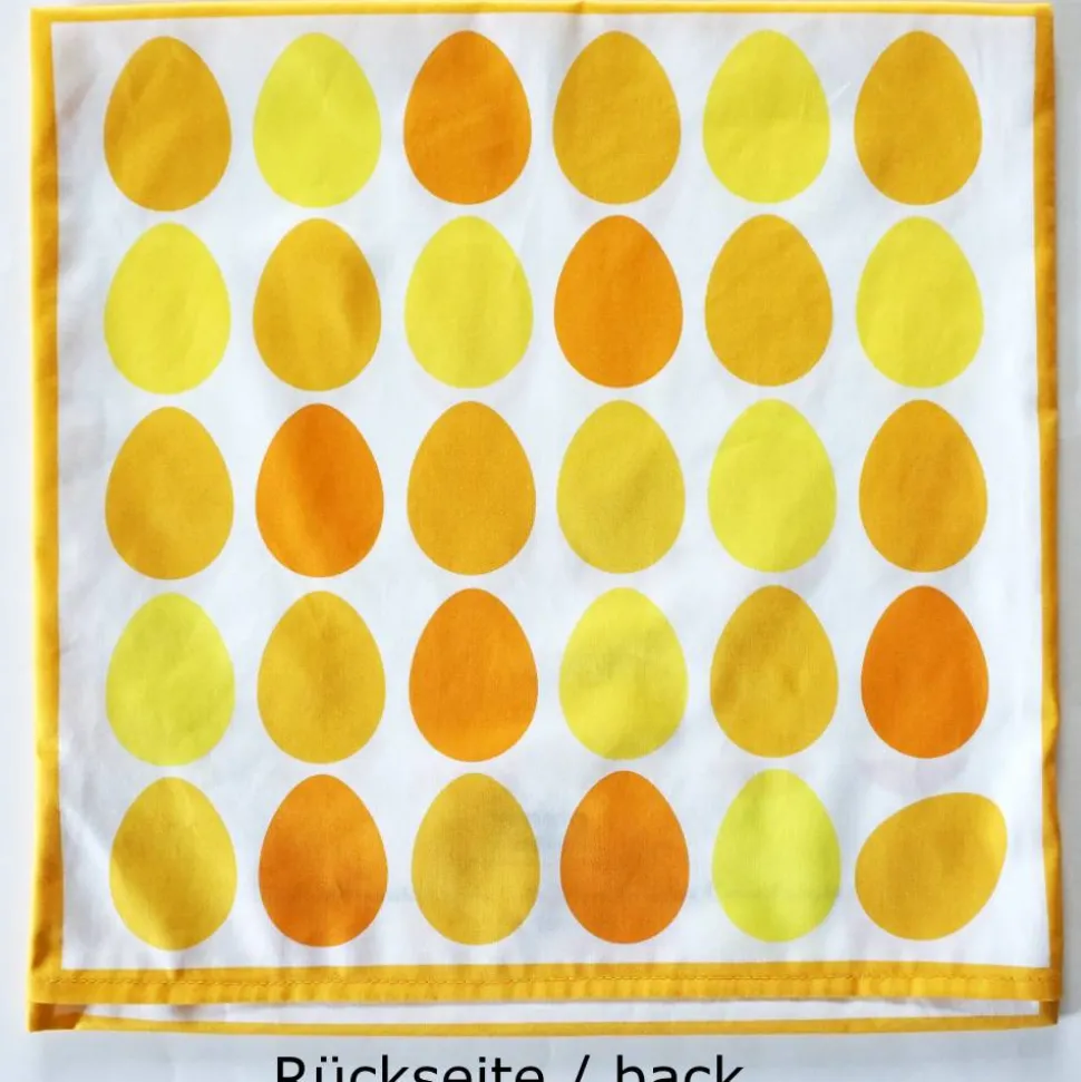 Das Ei-Muster gibt es auch als Geschenkpapier, Halstücher in verschiedenen Farben und Tischläufer.