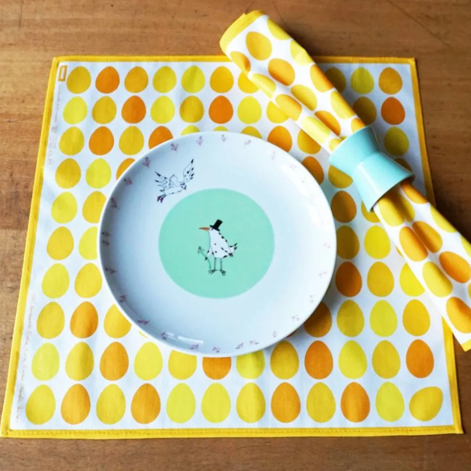 Das Ei-Motiv gibt es auch als Geschenkpapier, als Halstücher, Stoffbeutel, Kissenbezug und Tischläufer.