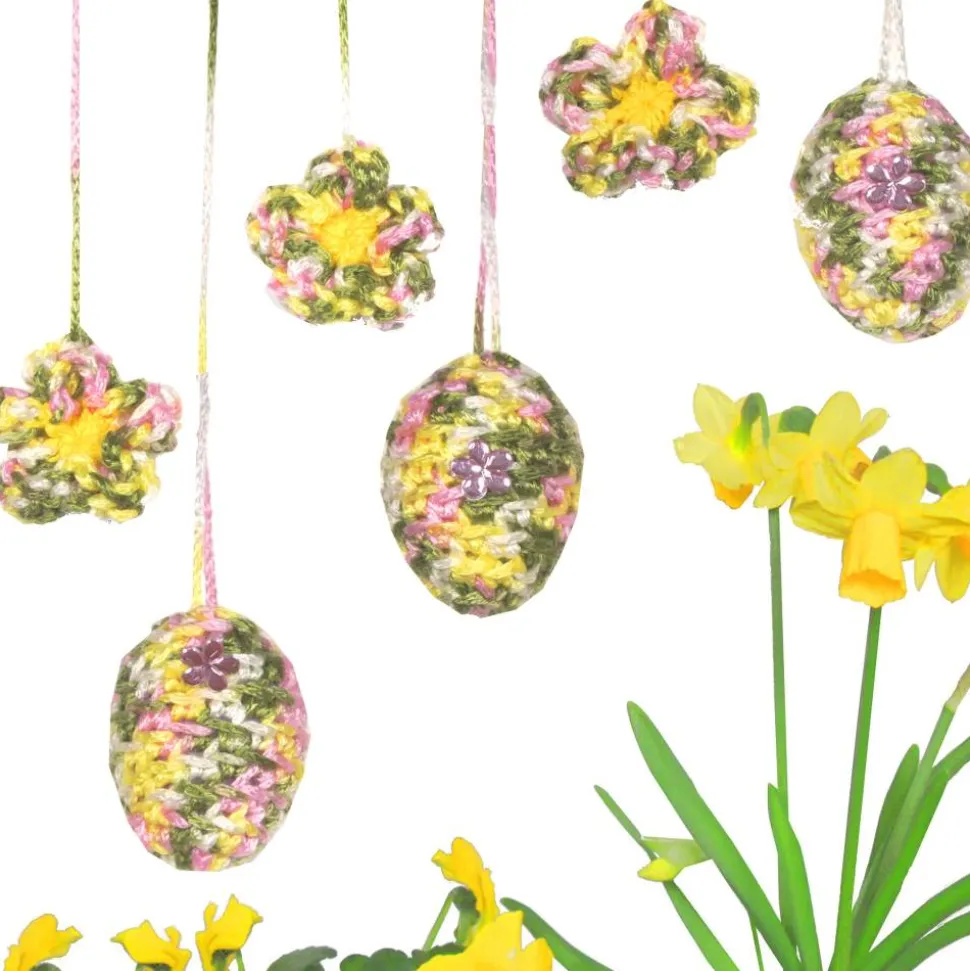 Ein liebevoll handgefertigtes Ostereier Set: Du erhältst 3 dekorative Ostereier und 3 Blüten zum Aufhängen – gehäkelt in zarten Pastellfarben wie rosa, weiß, grün und gelb. Jedes Ei wurde sorgfältig mit festen Maschen um ein Kunststoff Ei gearbeitet und mit funkelnden Kunststoffblüten als glänzendes Highlight verziert.