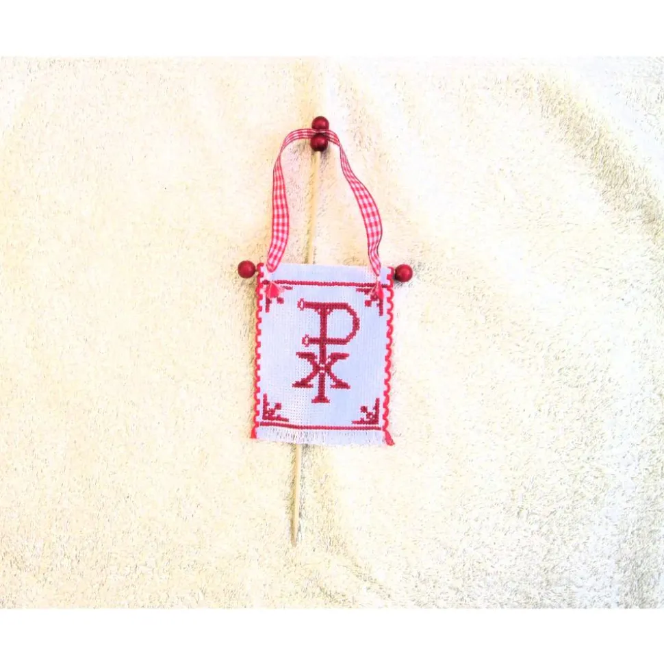 Religiöses Kreutzstich Motiv auf fein gewebten Aida Band, mit rotem Randmuster unten mit Fransen.