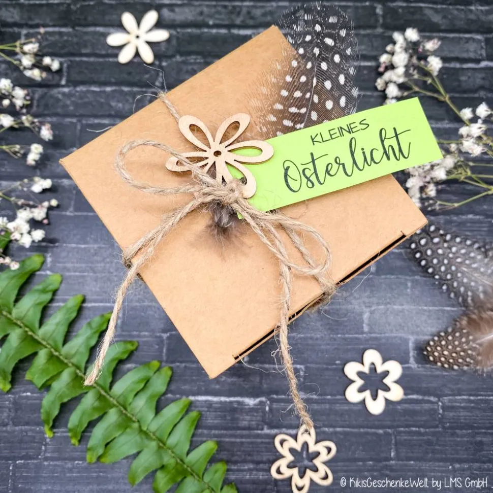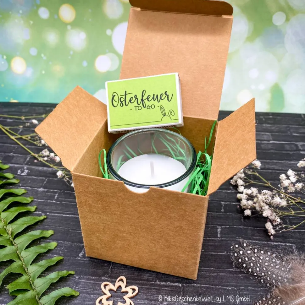 Die Schachtel (7,5×7,5×7,55 cm) ist befüllt mit einer Kerze inkl. Schriftzug (Brennzeit ca. 12 Stunden), Streichhölzern mit Aufkleber (Osterfeuer to go).