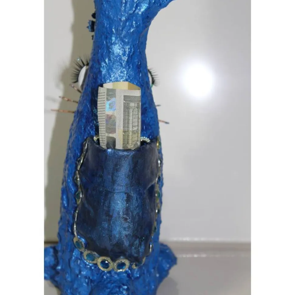 Witziges Upcycling-Projekt aus einer Glasflasche, gestaltet mit Pappmache, Modeliermasse, Pailetten, Glitzersteinen und Acrylfarbe.