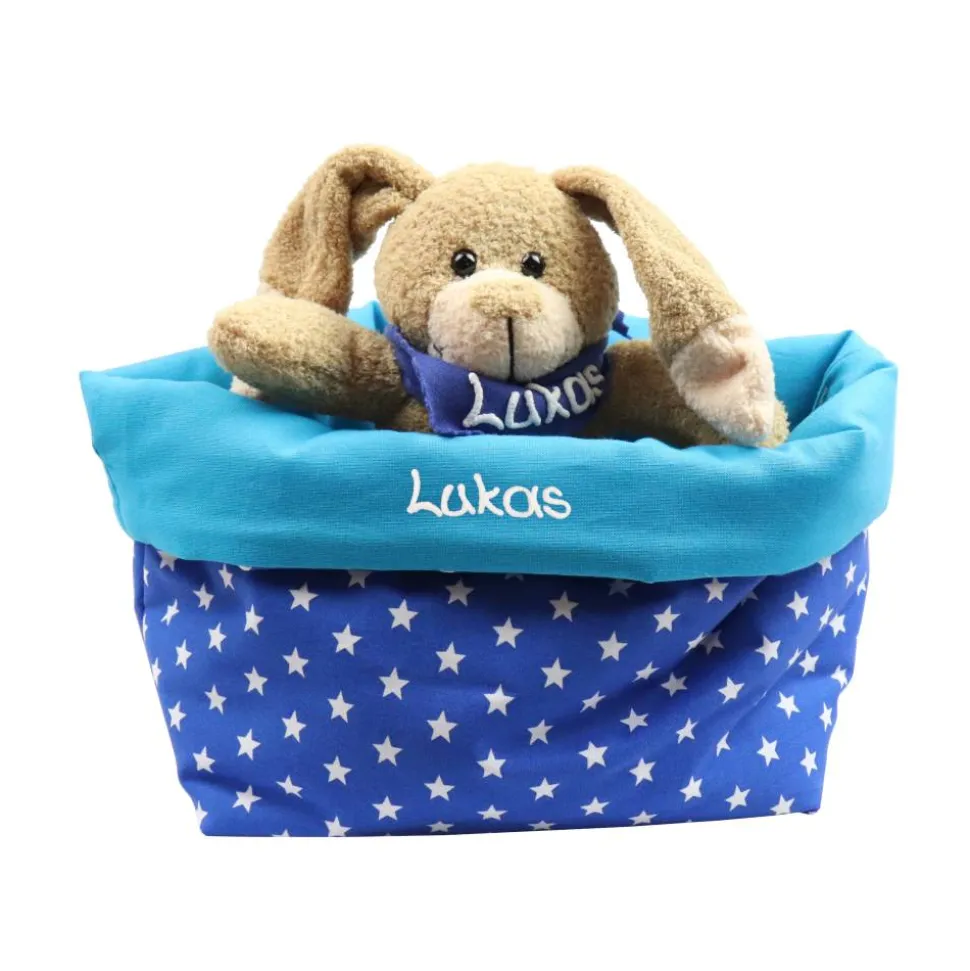 Ein tolles Ostergeschenk für große und kleine Kinder. Ein Stoffkörbchen zum Befüllen und ein niedlicher Osterhase, der genauso wie das Utensilo mit dem Namen des Kindes beschriftet wird.