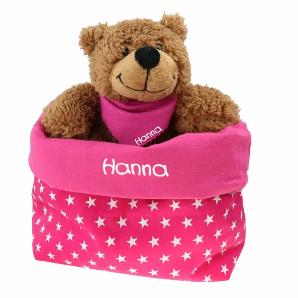 Ein tolles Ostergeschenk für große und kleine Kinder. Ein Stoffkörbchen zum Befüllen und ein niedlicher Kuschelteddy, der genauso wie das Utensilo mit dem Namen des Kindes beschriftet wird.