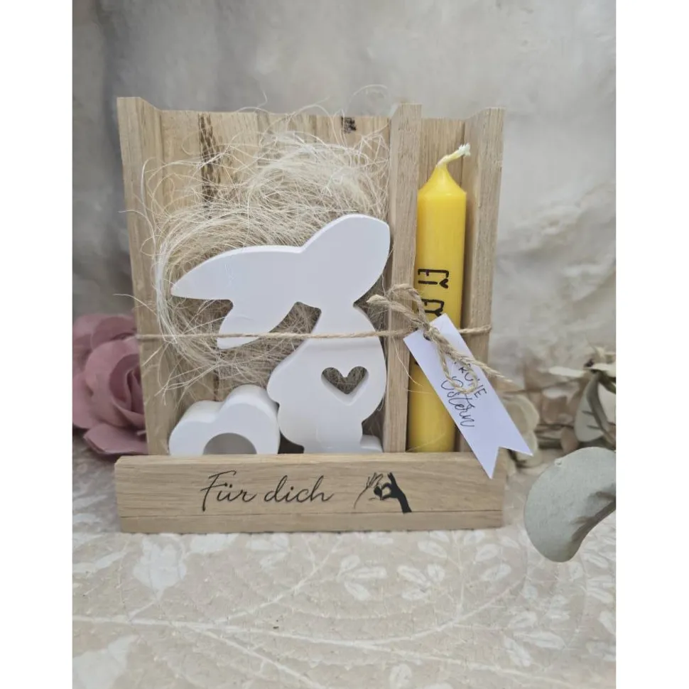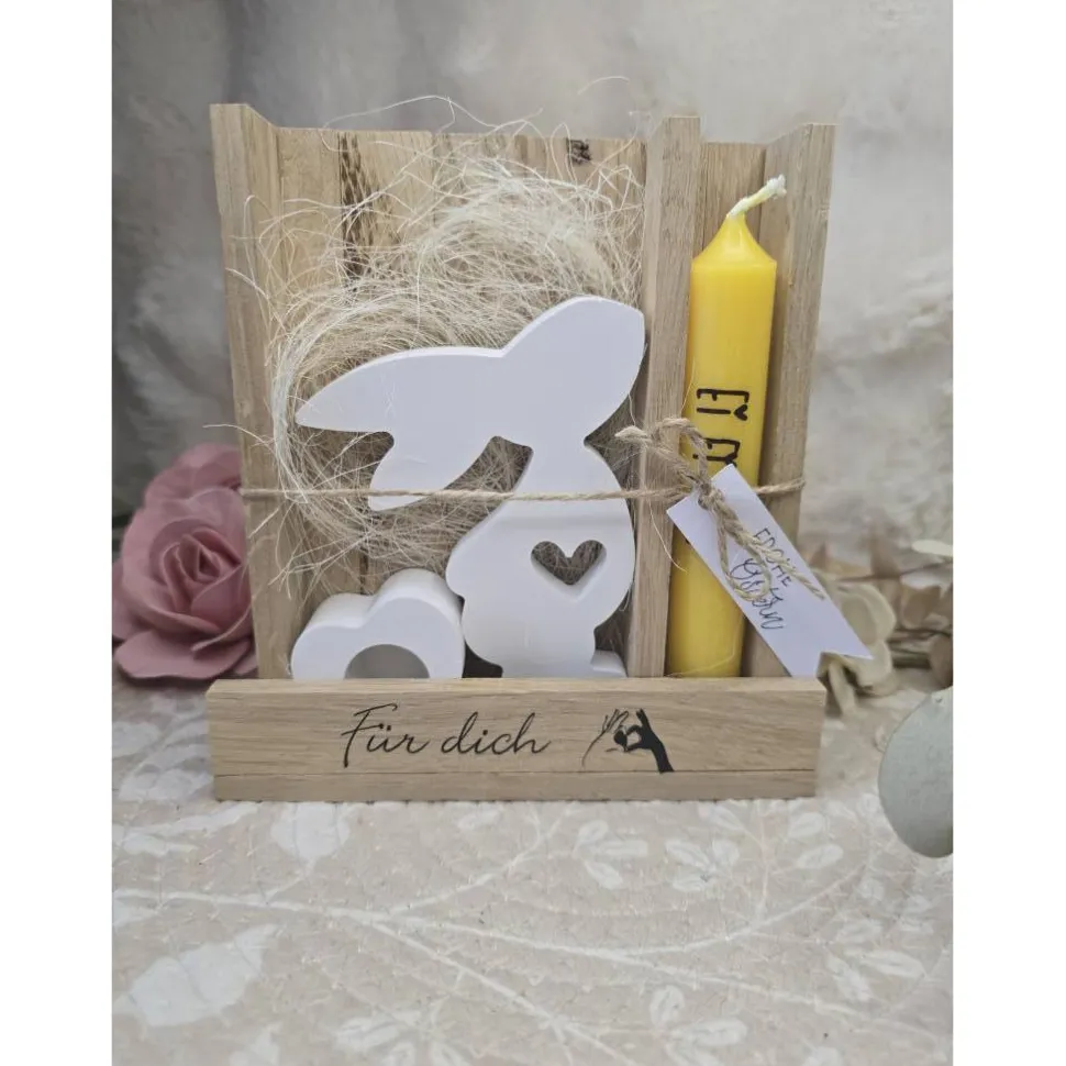 In der dekorativen Holzbox (16 cm breit, 17 cm hoch, 4,5 cm tief) findest du einen schlichten Hasen aus Raysin sowie einen herzförmigen Kerzenhalter aus Raysin. Die Kombination aus Holz, Raysin und natürlichen Dekoelementen sorgt für ein modernes und harmonisches Geschenk, das sofort bereit zum Verschenken ist.