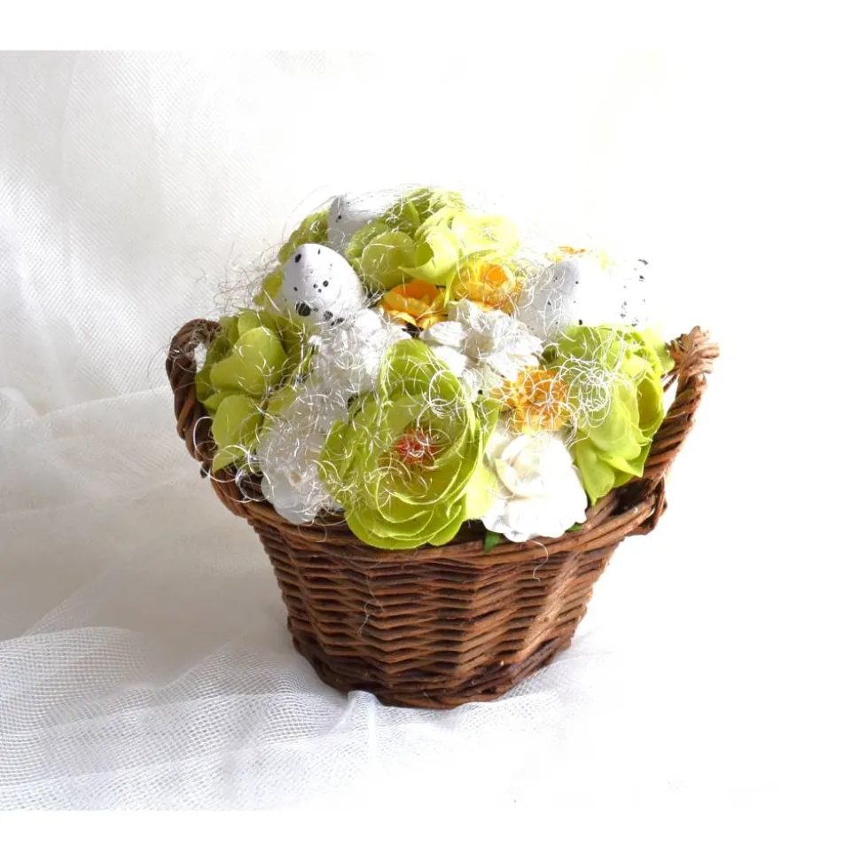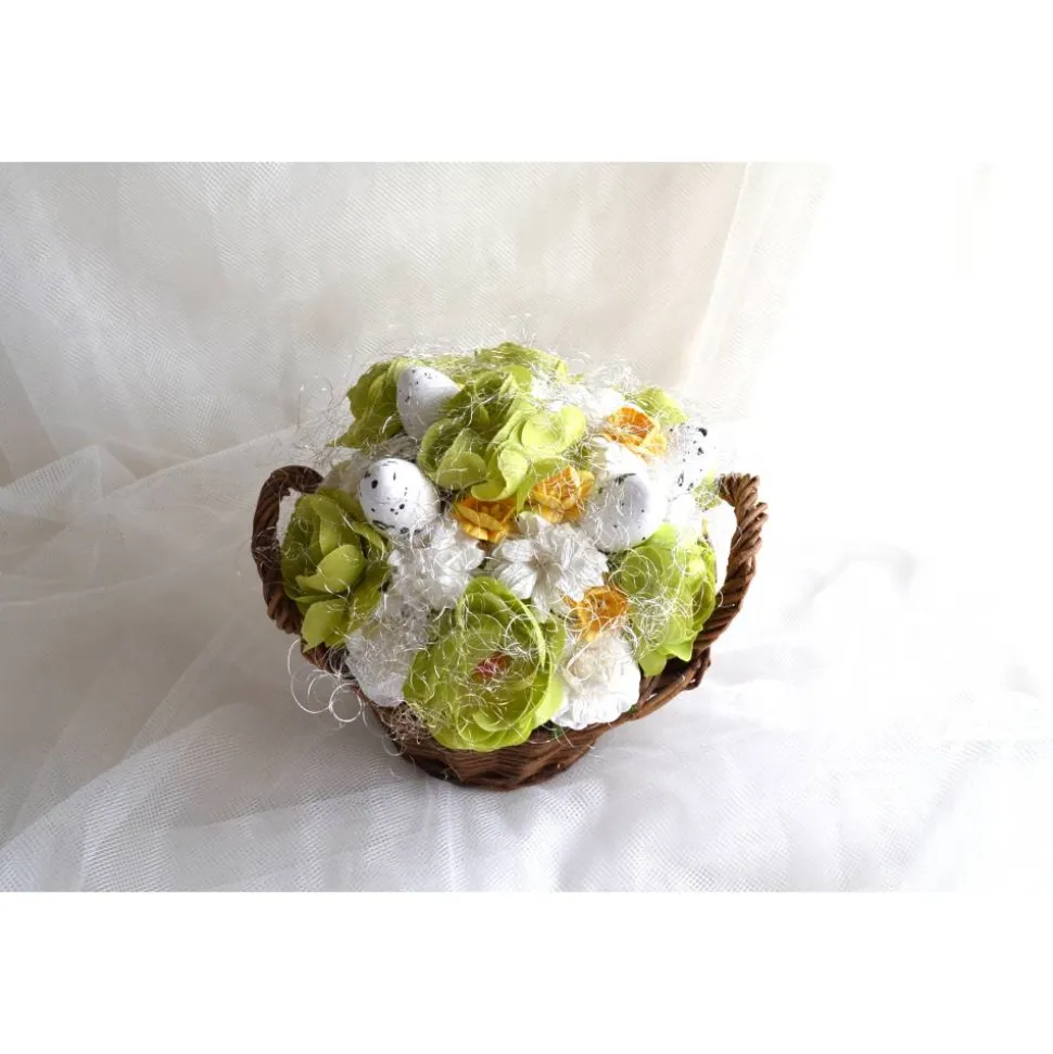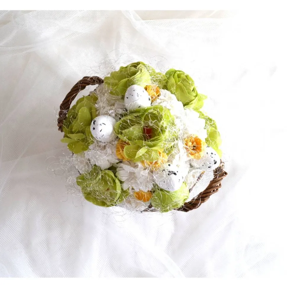 Material: Korb, Feenhaar, Stoffblumen, Styroporeier