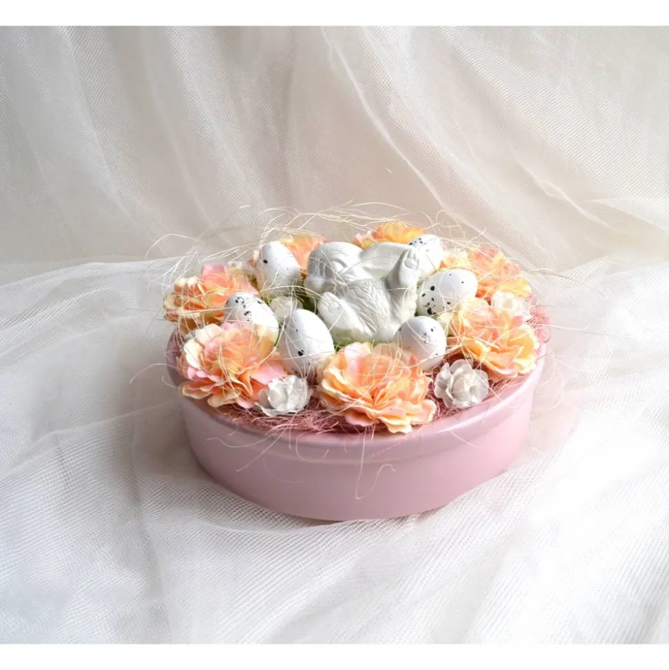 Dieses Ostergesteck in rosa-lachs-weiß ist eine gelungene Osterdekoration. Dafür bedarf es immer wieder neue Darsteller wie dieser niedliche Keramikhase, der sich in seinem Blumenbett aus lachsfarbenen Begonien und kleinen weißen Rosen sichtlich wohlfühlt. Ein originelles Dekostück, das in Ihrem Wohnambiente viel Wirkung entfaltet. Das Gesteck ist liebevoll in Handarbeit hergestellt. Ebenso wie der Keramikhase sind auch die Begonien von Hand gefertigt. Größe: Durchmesser ca. 19 cm, Höhe 5 cm.
