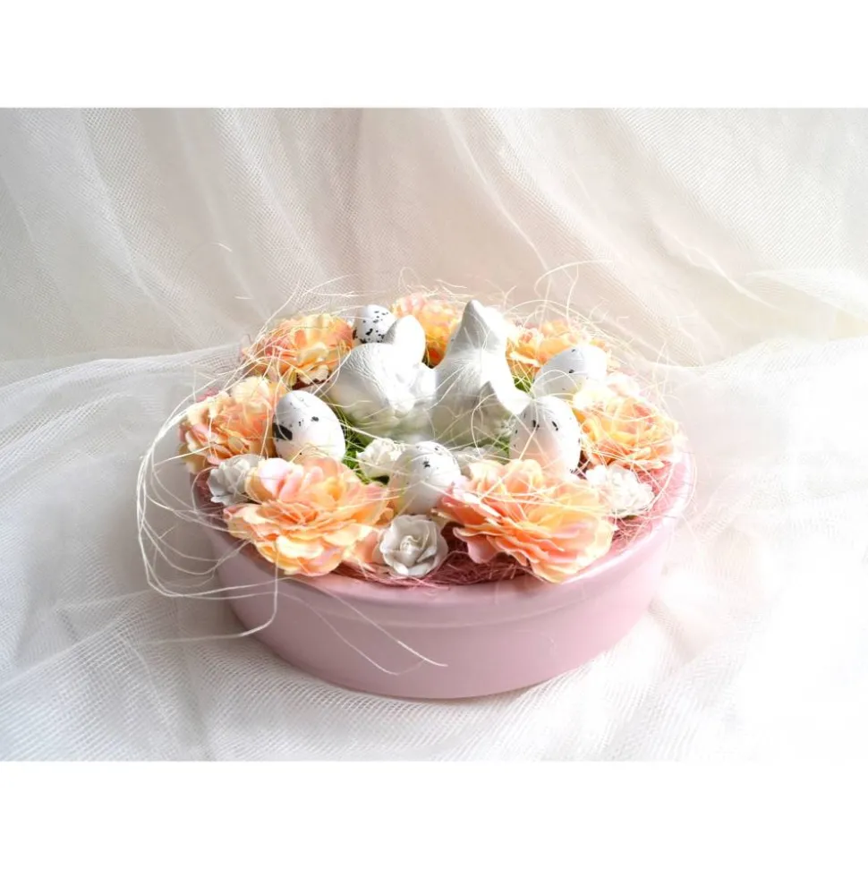 Ostergesteck Nr. 1 mit Begonien in rosa Keramikschale mit liegendem Keramikhase