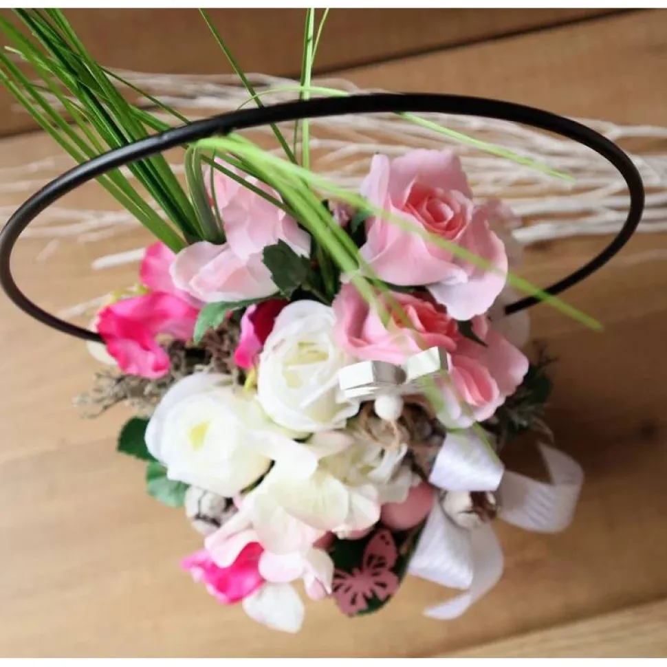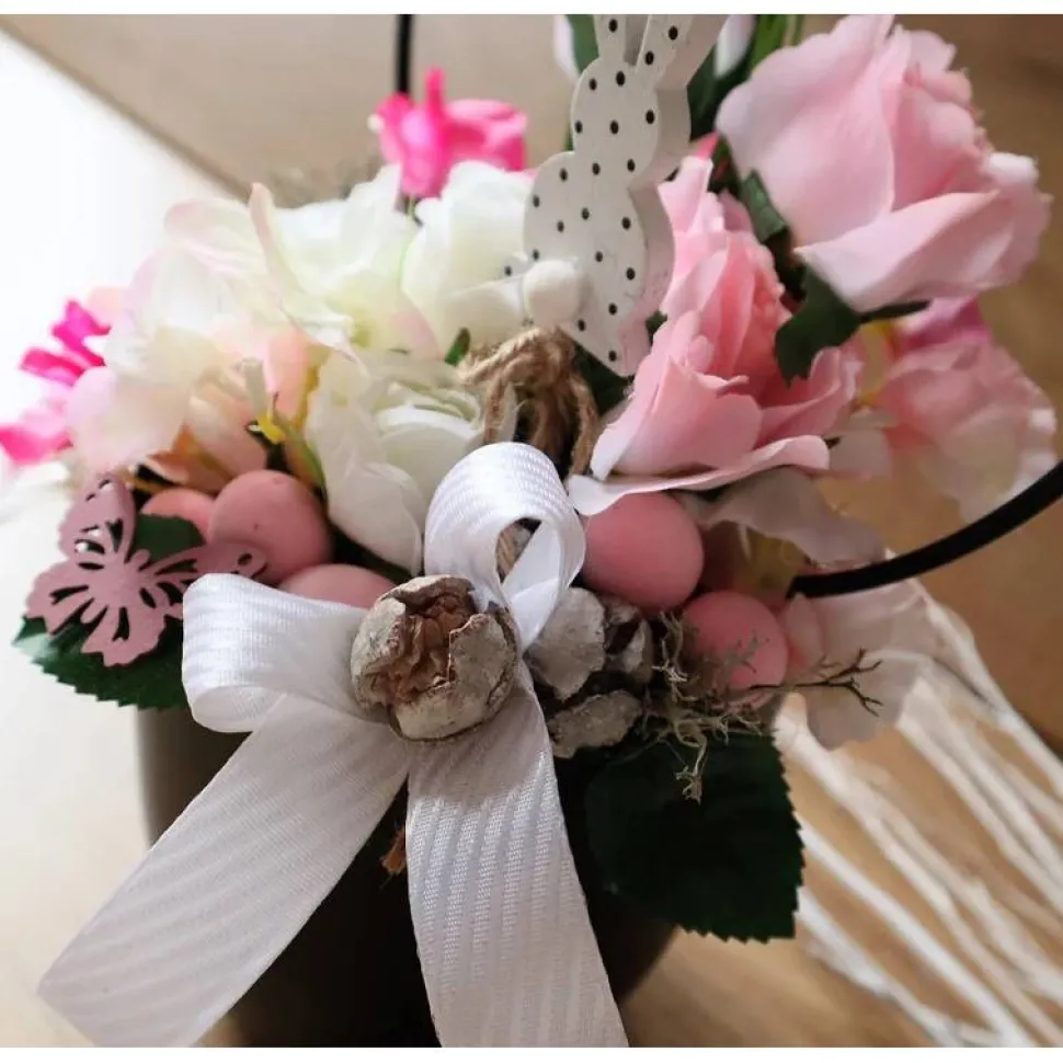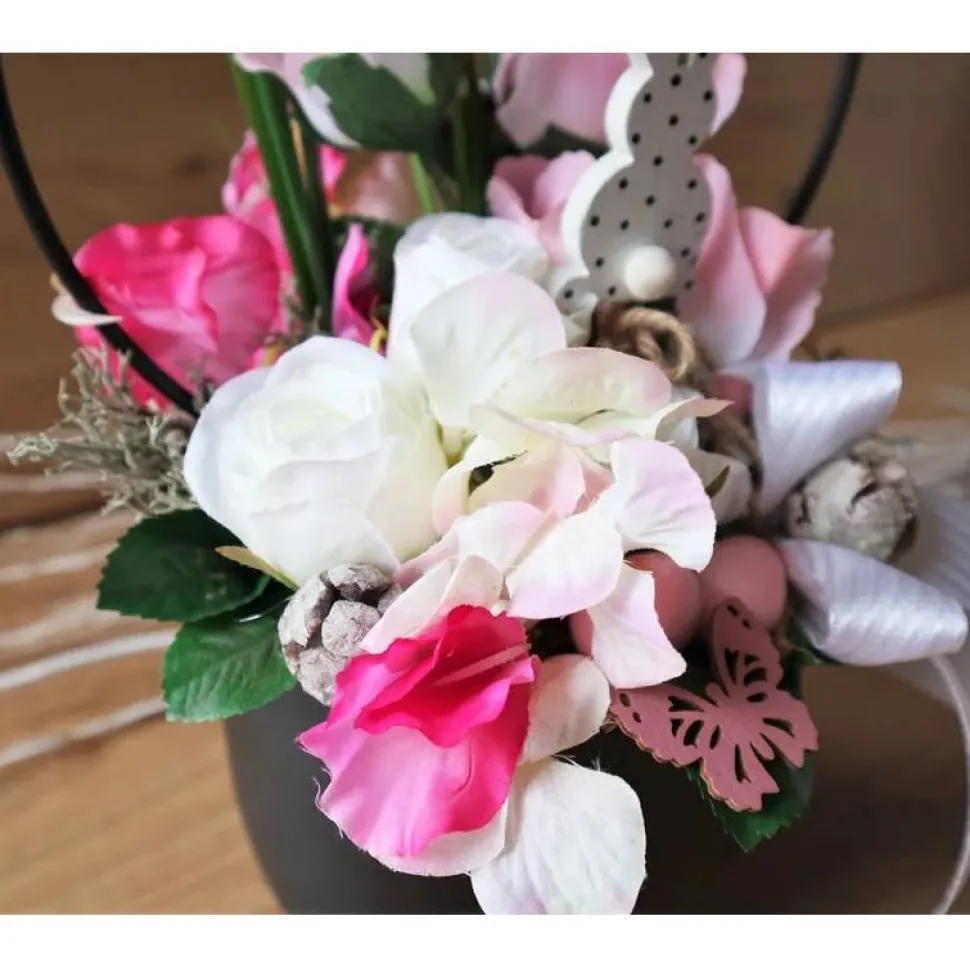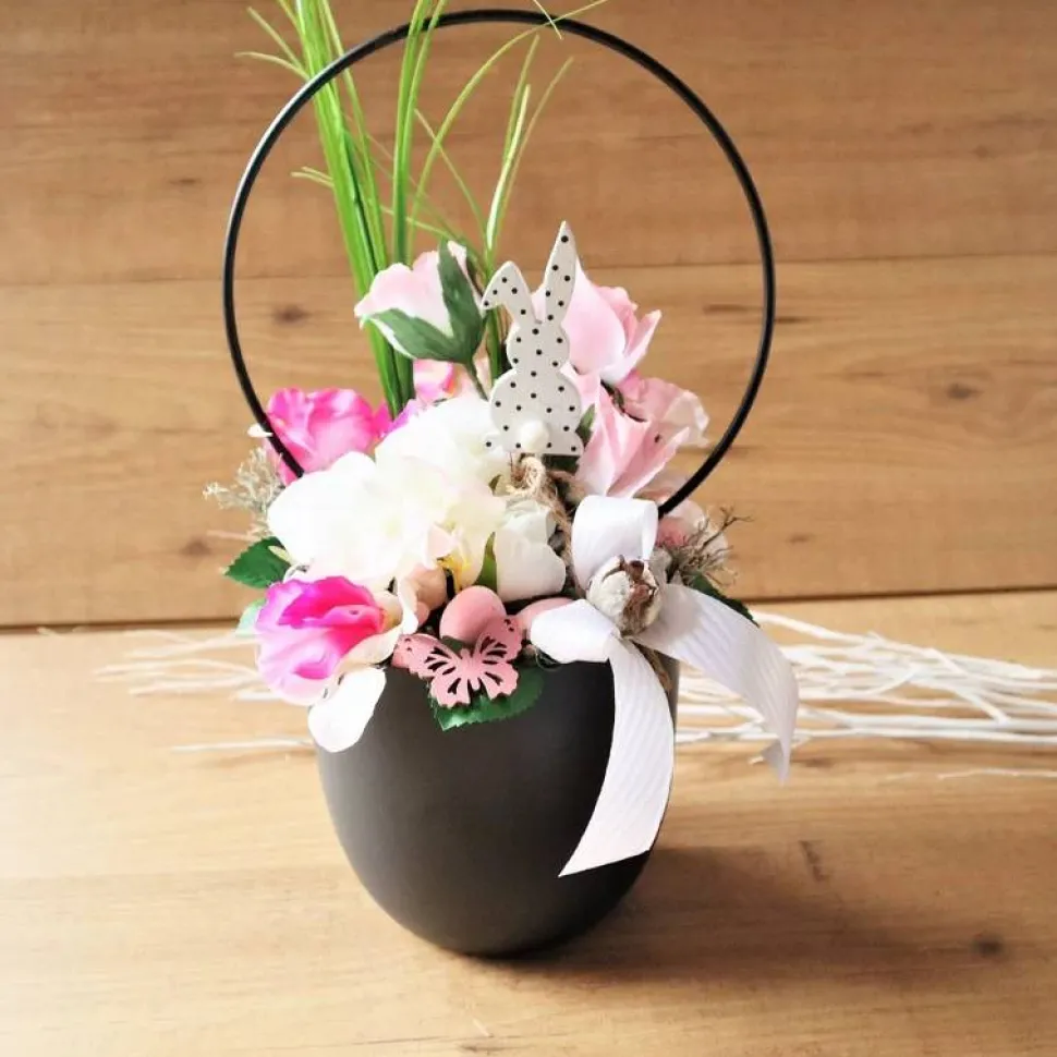Material: Metalltopf, Metallreifen, künstliche Blüten und Grün, Holzhase