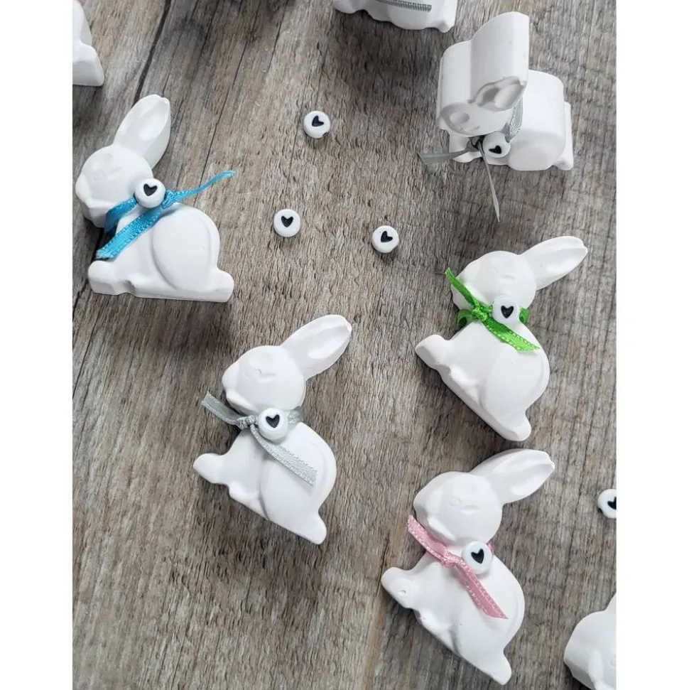 Die Häschen wurden mit verschieden farbigem Halsband und Herzchenperle versehen.