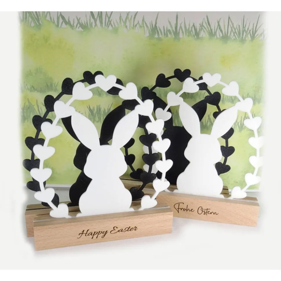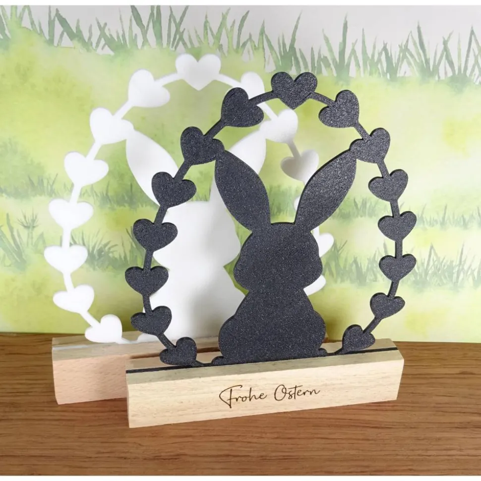 Die Häschen sind in einem Kranz mit Herzchen. Zur Auswahl schwarz oder weiß, in 3D-Druck erstellt.