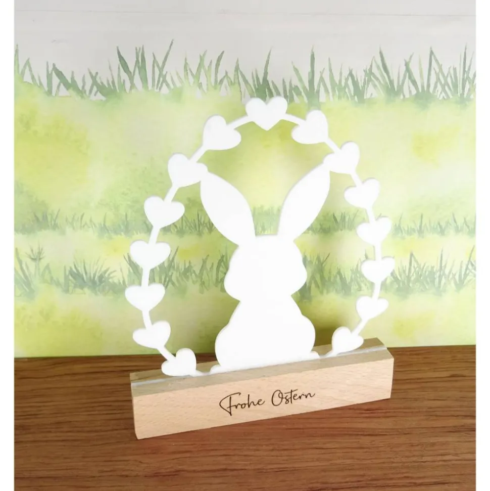Der Sockel ist aus Holz und mit Laser-Gravur „Frohe Ostern“ oder „Happy Easter“.