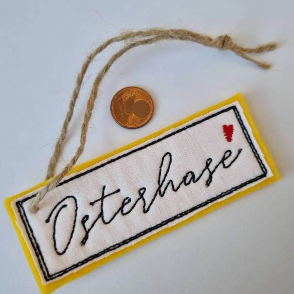Der weiße Vintage-Stoff stammt aus den 60er Jahren und war in seinem Vorleben Teil einer edlen Aussteuer-Bettwäsche. Er ist in der sog. „Linon-Webart“ hergestellt worden und erinnert daher mit seiner leichten Struktur an einen Leinen-Stoff. Er wurde grob ausgeschnitten und passt so perfekt zum gestickten Doodle-Stich, der die geschwungene Handschrift „Osterhase“ einrahmt. Der Baumwollstoff kann mit der Zeit etwas ausfransen, dies stellt keinen Makel dar, sondern ist ein gewünschter Effekt des angesagten „Patina-Look“.