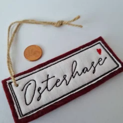 Der weiße Vintage-Stoff stammt aus den 60er Jahren und war in seinem Vorleben Teil einer edlen Aussteuer-Bettwäsche. Er ist in der sog. „Linon-Webart“ hergestellt worden und erinnert daher mit seiner leichten Struktur an einen Leinen-Stoff. Er wurde grob ausgeschnitten und passt so perfekt zum gestickten Doodle-Stich, der die geschwungene Handschrift „Osterhase“ einrahmt. Der Baumwollstoff kann mit der Zeit etwas ausfransen, dies stellt keinen Makel dar, sondern ist ein gewünschter Effekt des angesagten „Patina-Look“.