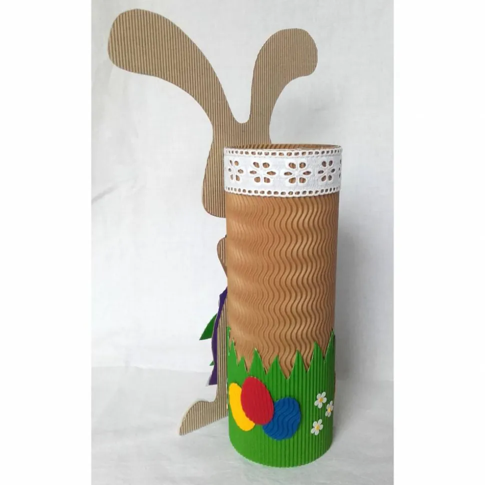 Der Hase ist sehr sorgfältig aus mehreren Lagen Wellpappe und Tonkarton gearbeitet.