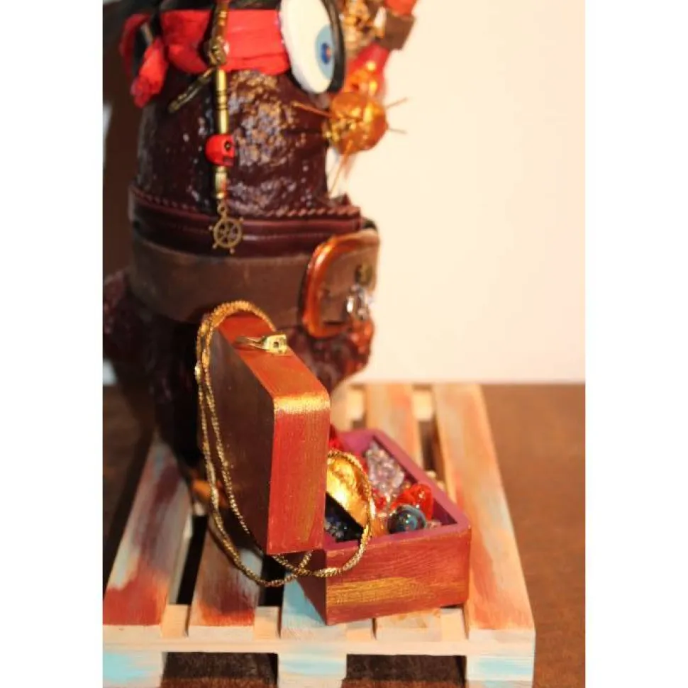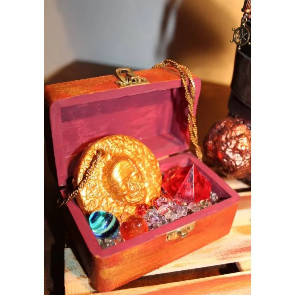 Die Schatzkiste ist aus Holz, mit Acrylfarben bemalt. Der Schatz besteht aus einer handgefertigten „Totenkopf-Dublone“ aus Modelliermasse, die an einer Kette hängt, unzähligen kleinen Glitzersteinchen aus Kunstsstoff und Natursteinchen, kleinen Ostereiern aus Glas und einem großen „Rubin“ aus Kunststoff.