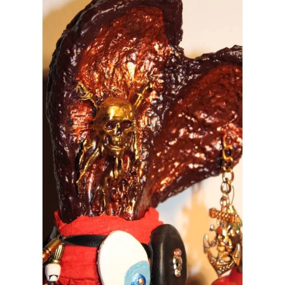 Witziges Upcycling-Projekt aus einer Glasflasche, gestaltet mit Altpapier, Glasfläschchen, Modelliermasse, Lederresten und Acrylfarbe. Tolle Effekte durch die verwendeten Gold- und Kupferfarben. Der Pirat unter den Osterhasen ;).