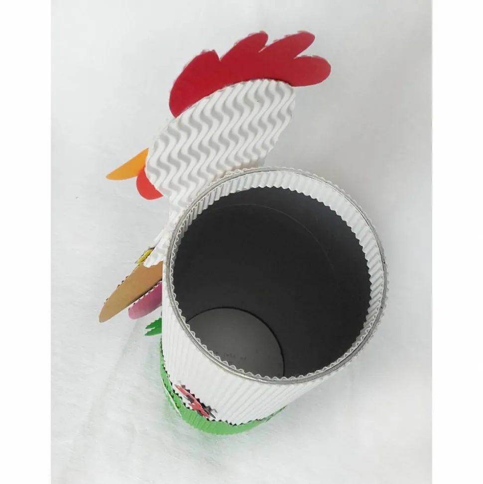 Dieses aufwändig gearbeitete Hühner-Osternest hat durch die Dose einen sicheren Stand. Bei der Dose handelt es sich um eine sorgfältig gereinigte leere Müslidose, die hier ein neues Leben erhält. Das Huhn ist sehr sorgfältig aus mehreren Lagen Wellpappe und Tonkarton gearbeitet.
